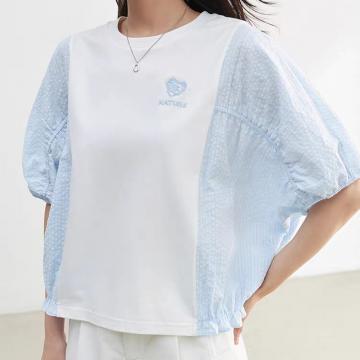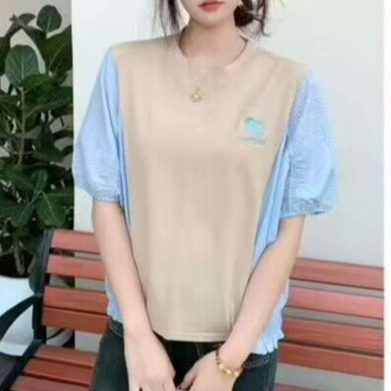 BY12501# 韩国春夏新款时尚休闲撞色拼接刺绣图案宽松短袖T恤上衣女 服裝批發女裝批發服飾貨源