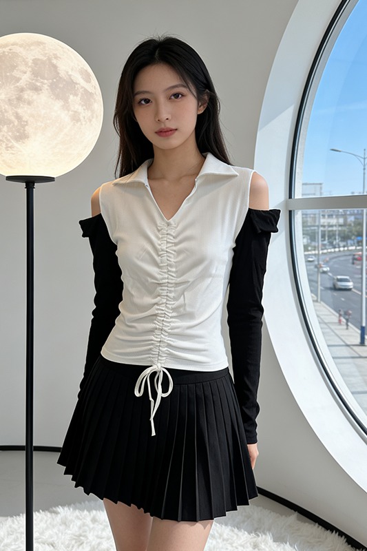 BY12595# 春季韩版洋气不规则女上衣长袖拼色T恤反领时尚小衫现S-XXL 服裝批發女裝批發服飾貨源