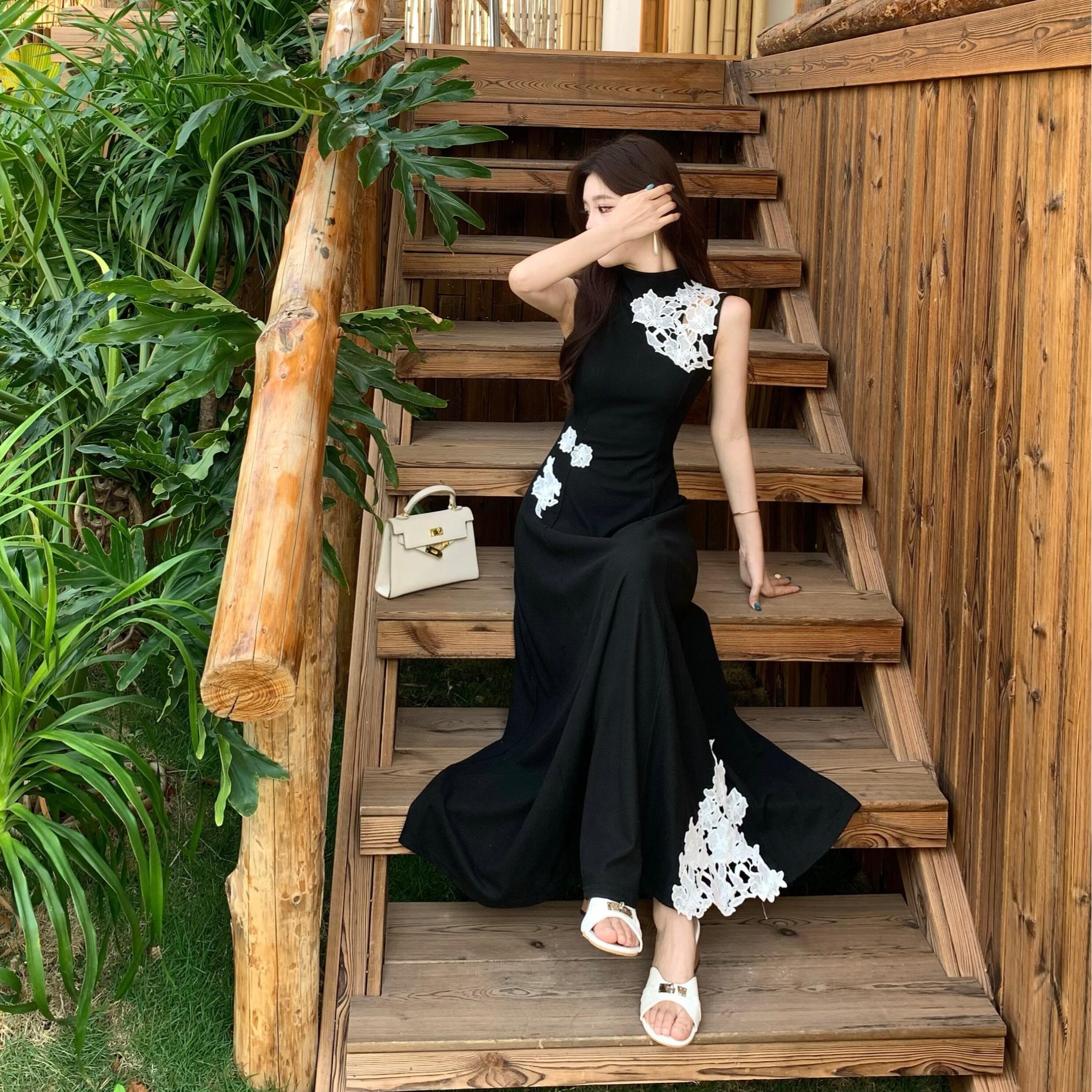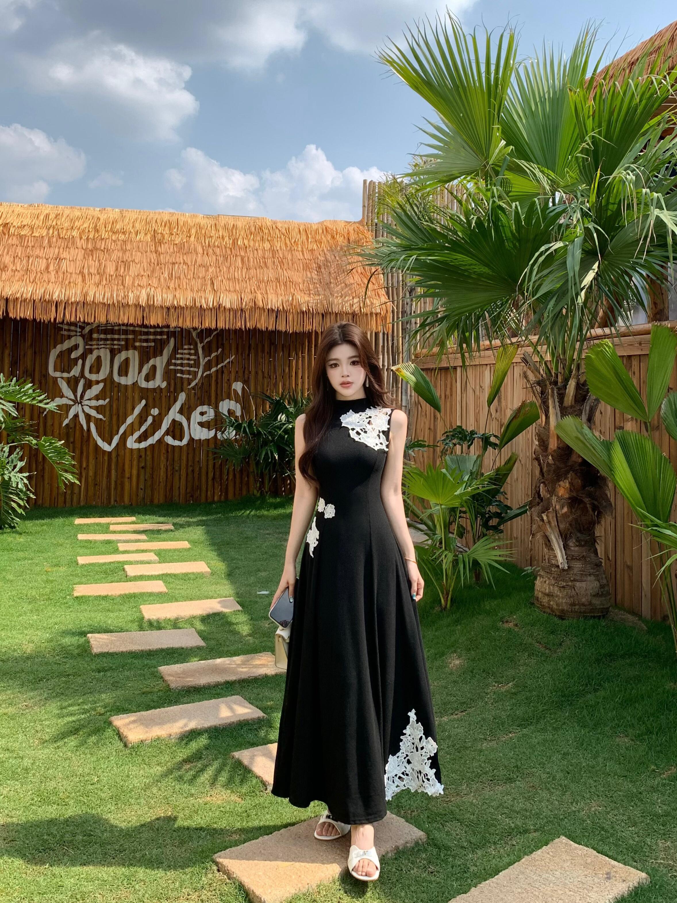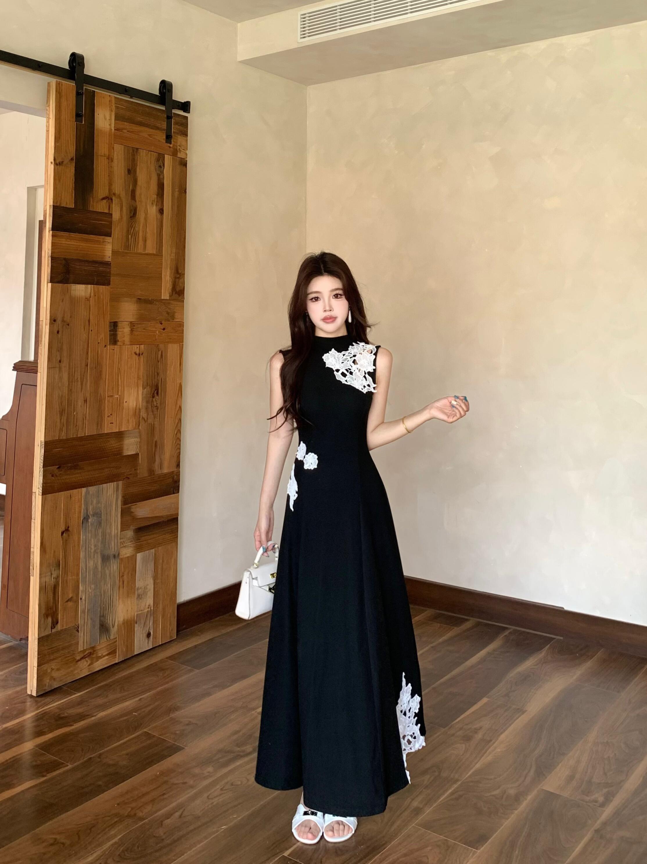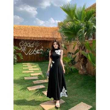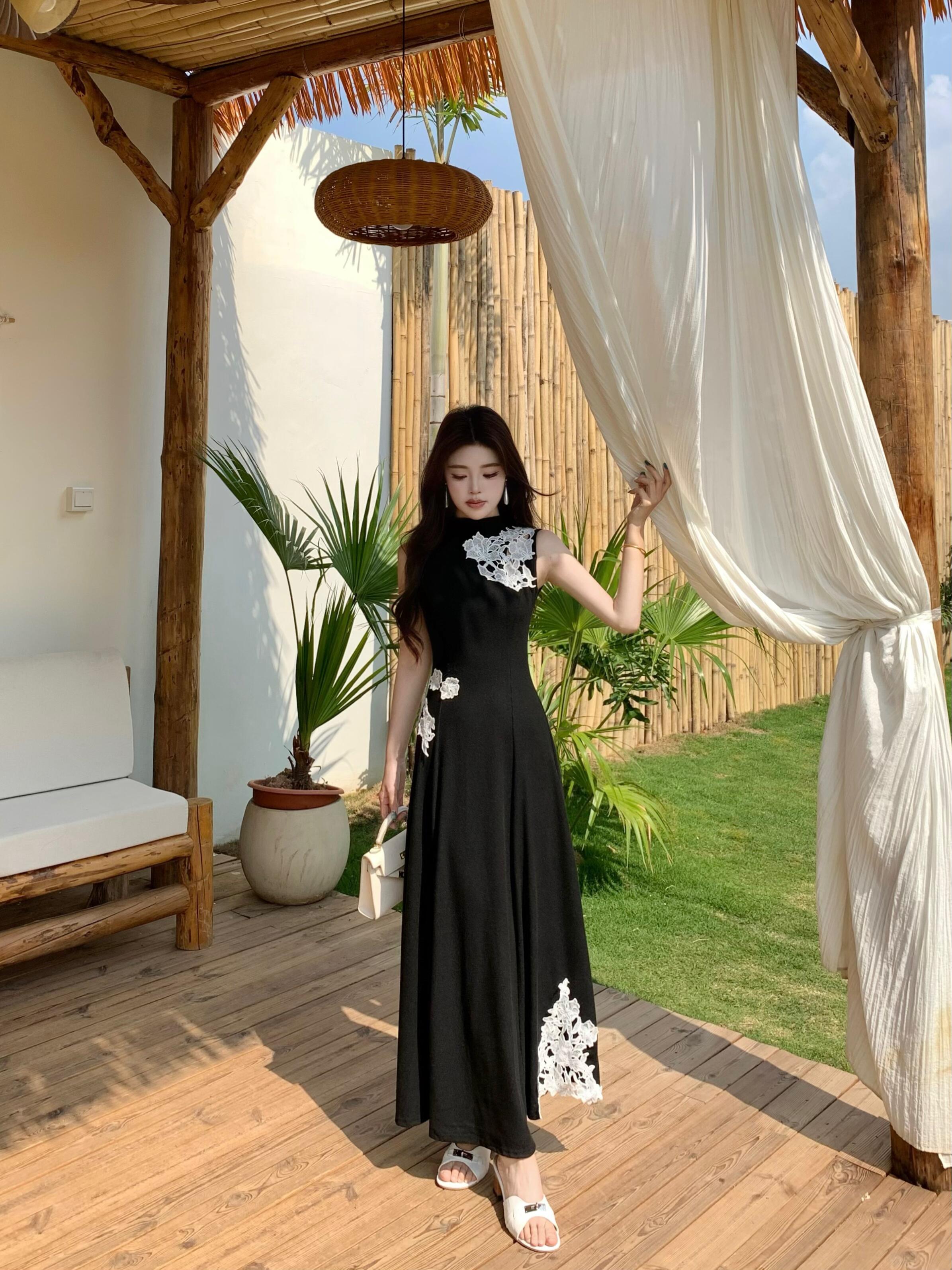 BY12646# 大码新中式立领无袖蕾丝刺绣针织连衣裙垂感高腰A字长裙夏 服裝批發女裝批發服飾貨源