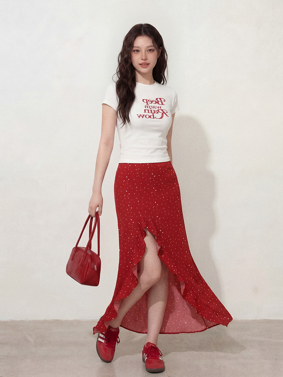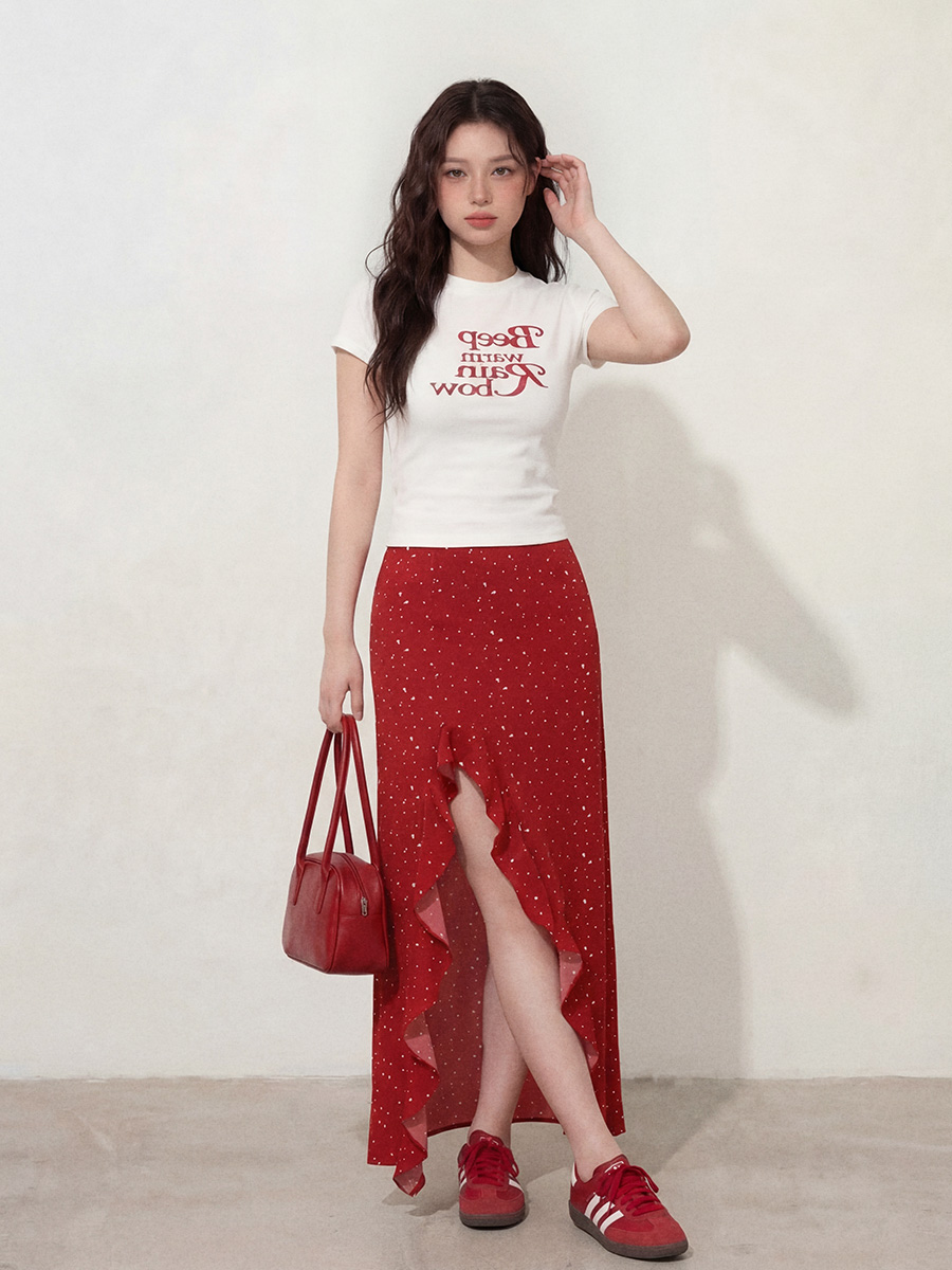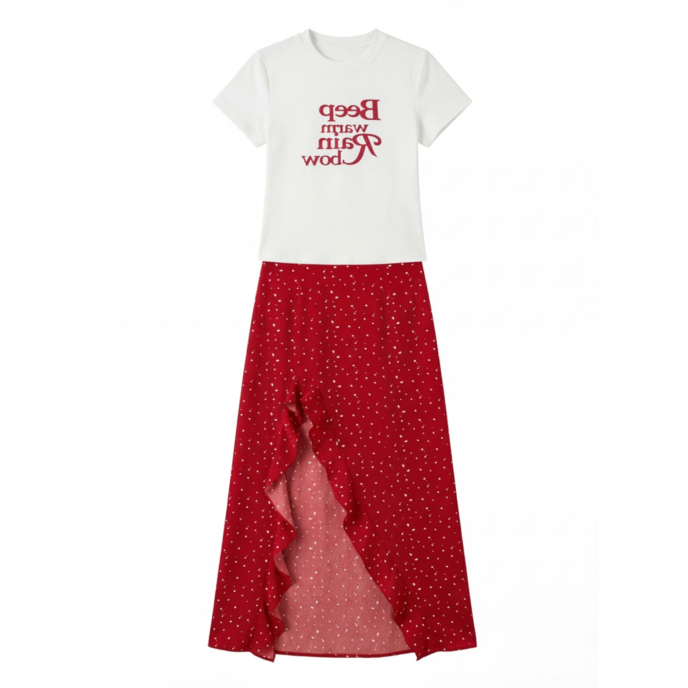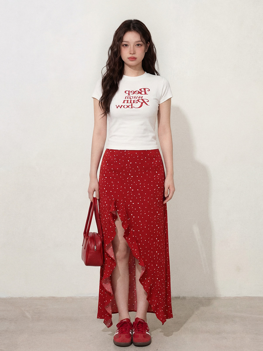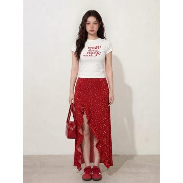 BY12661# L-4XL大码女装白色T恤短袖+夏季红色开叉花边裙摆长裙两件套 服裝批發女裝批發服飾貨源