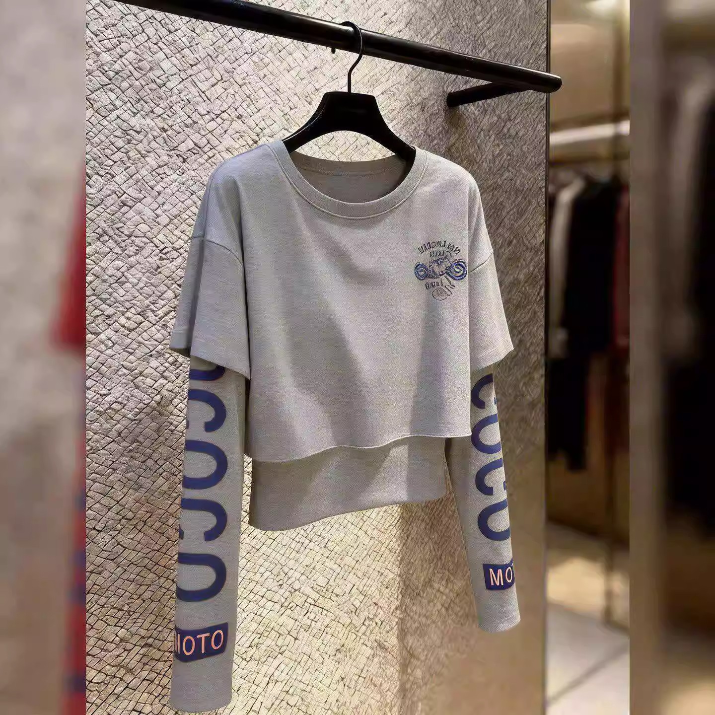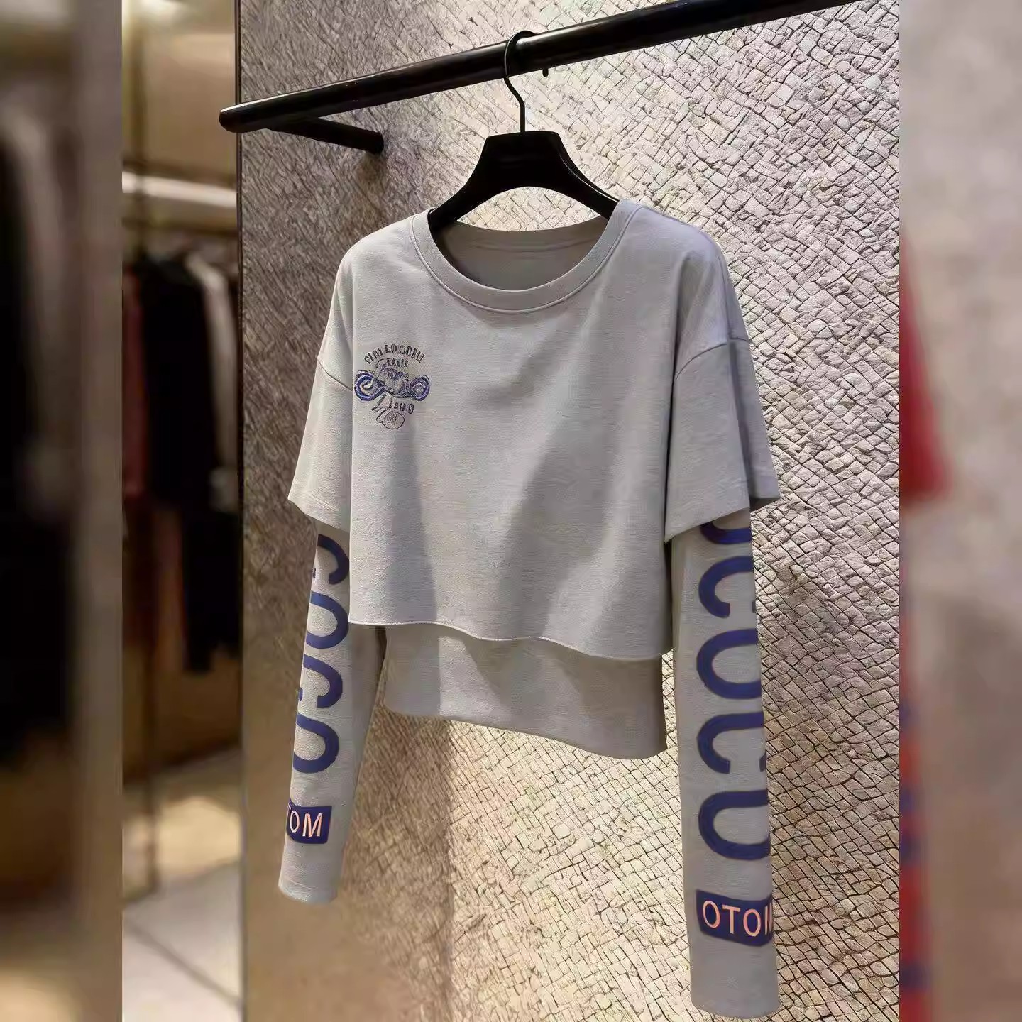 Home > 长袖T恤 > BY12674# 美式灰色假两件上衣女早春气质个性百搭休闲简约时尚高级长袖 服裝批發女裝批發服飾貨源