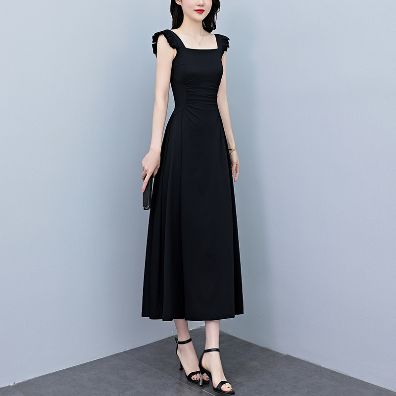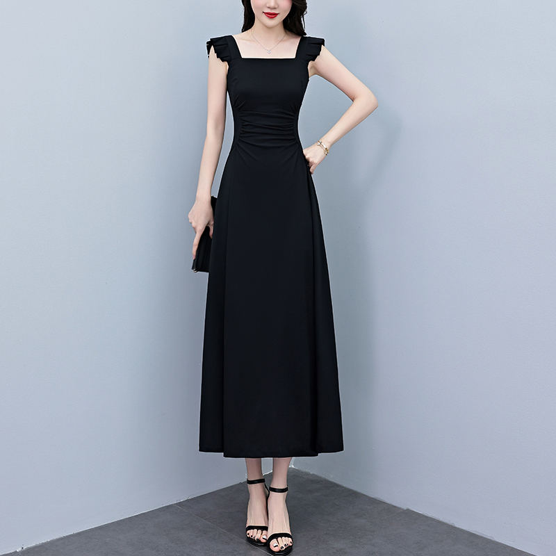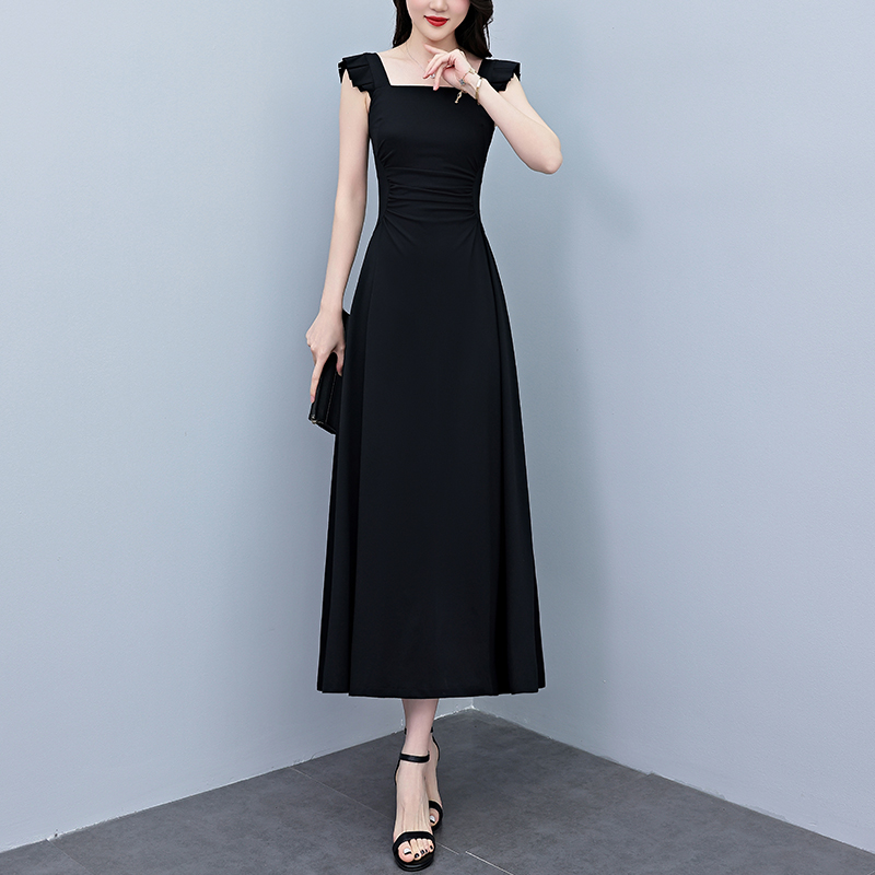 BY12896# 夏季新款赫本风黑色连衣裙女夏长款大码收腰显瘦胖mm小黑裙子 服裝批發女裝批發服飾貨源