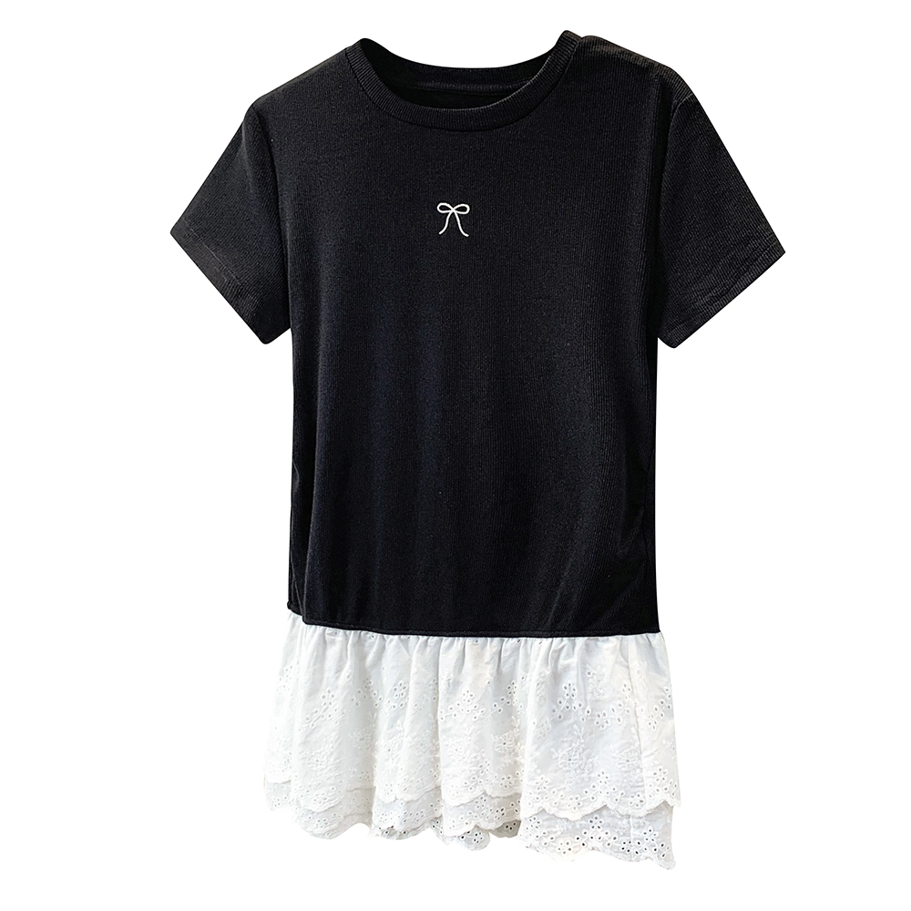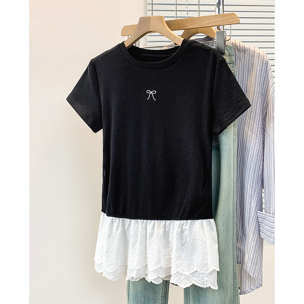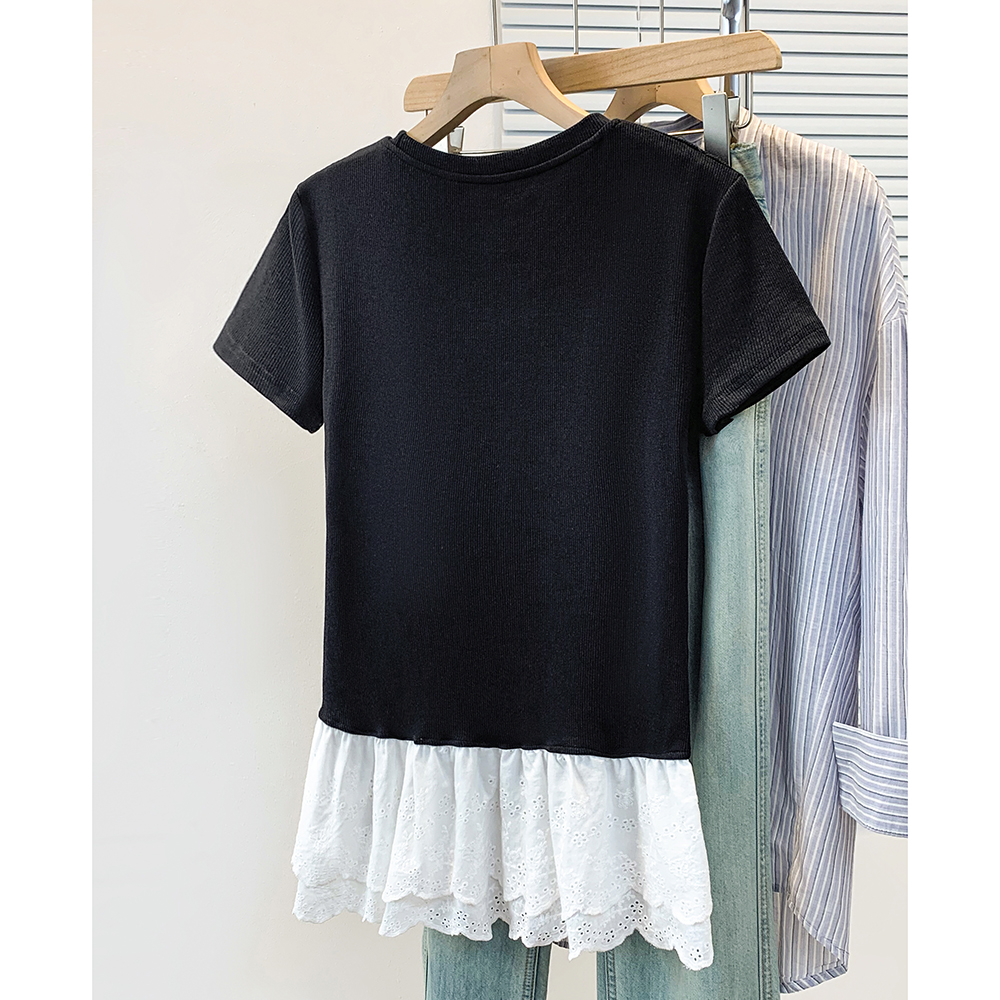 BY12958# 大码胖妹妹圆领短袖t恤女正肩新款花边下摆显瘦修身上衣 服裝批發女裝批發服飾貨源