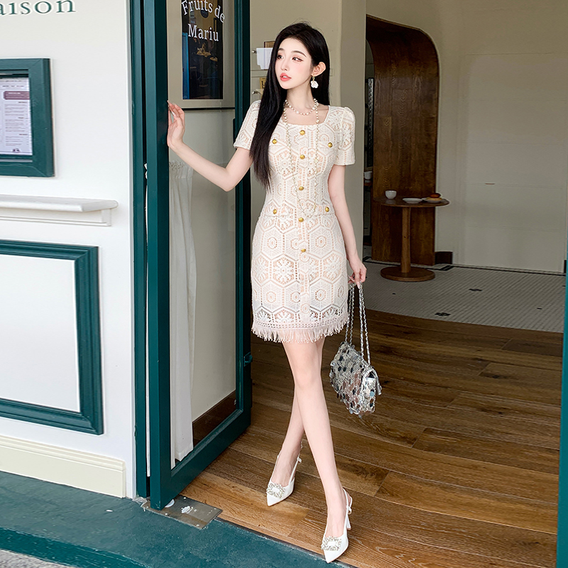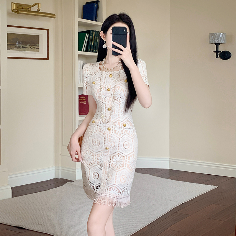BY13152# 名媛风蕾丝拼接方领小香风流苏纽扣气质连衣裙 服裝批發女裝批發服飾貨源