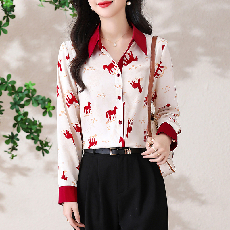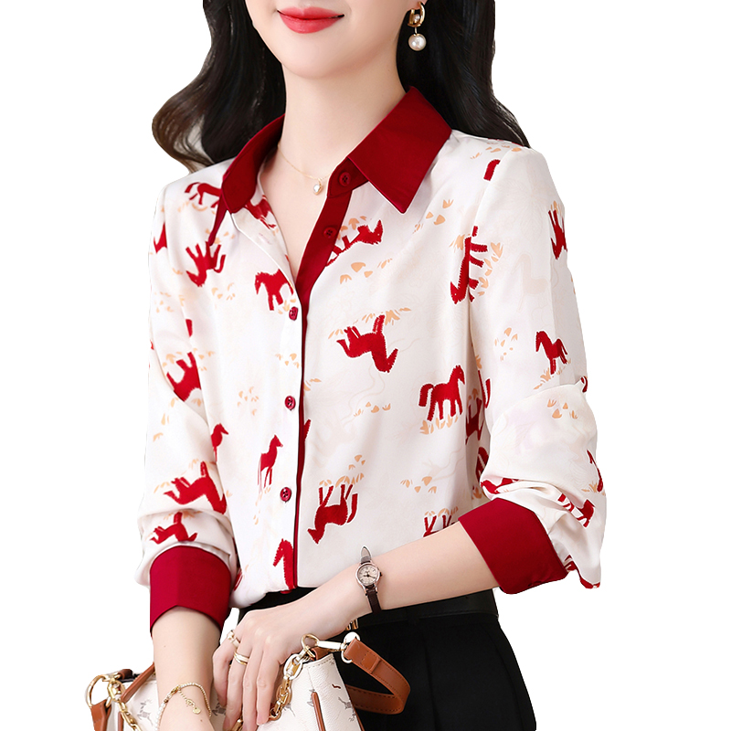 BY13262# 春季新款女装撞色翻领小马印花气质百搭长袖衬衫 服裝批發女裝批發服飾貨源