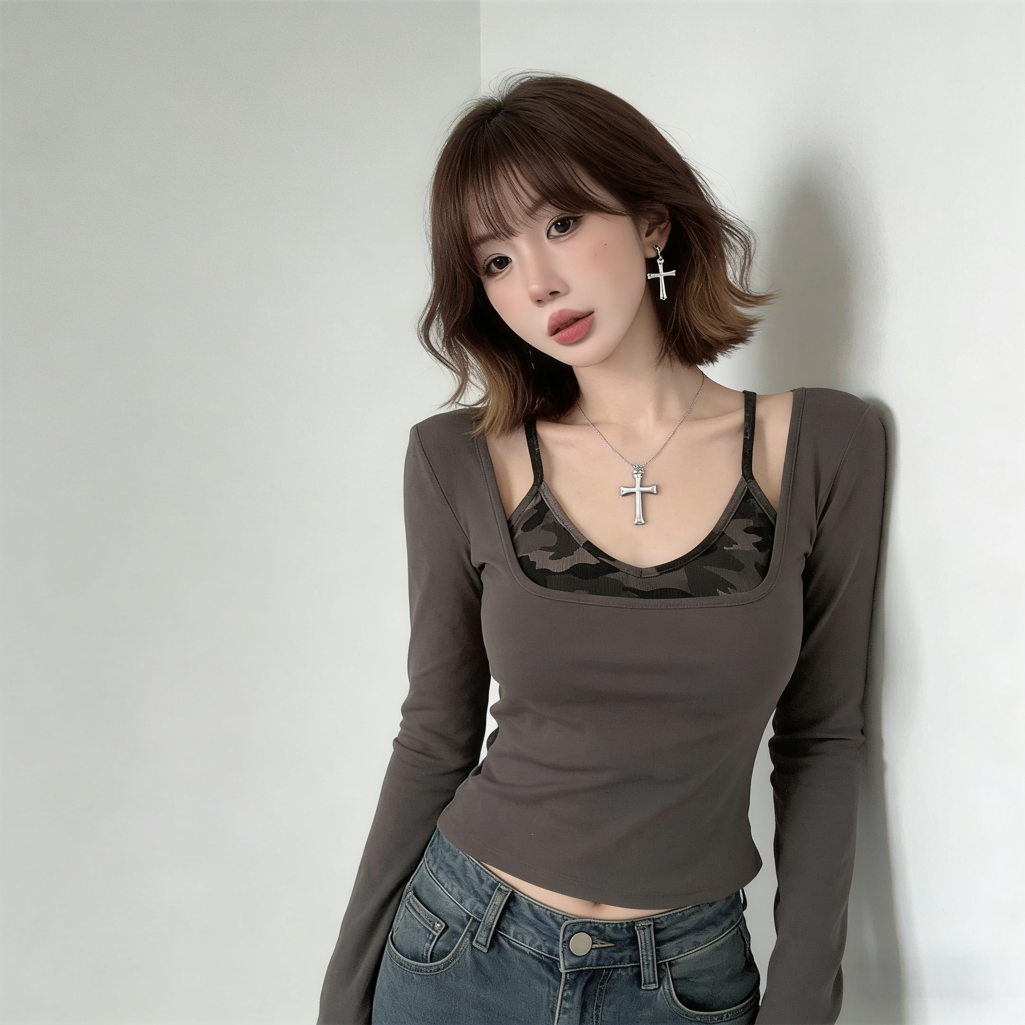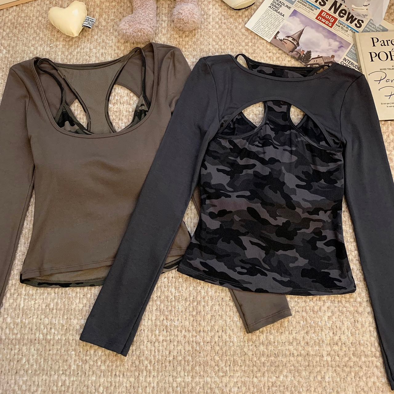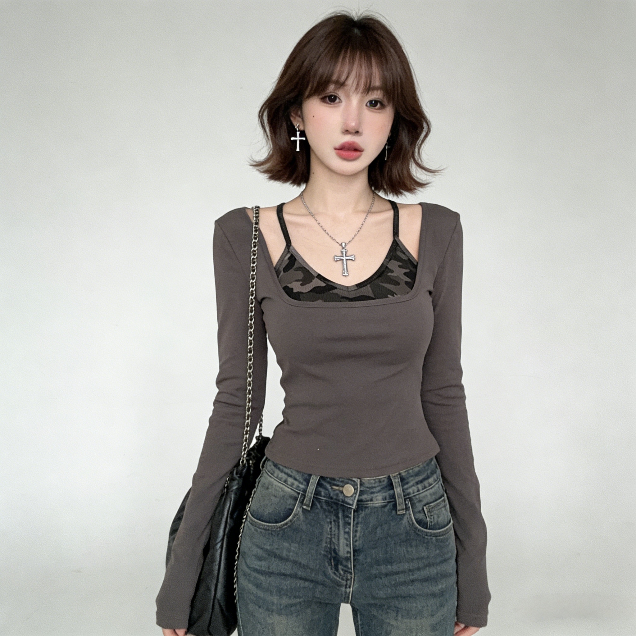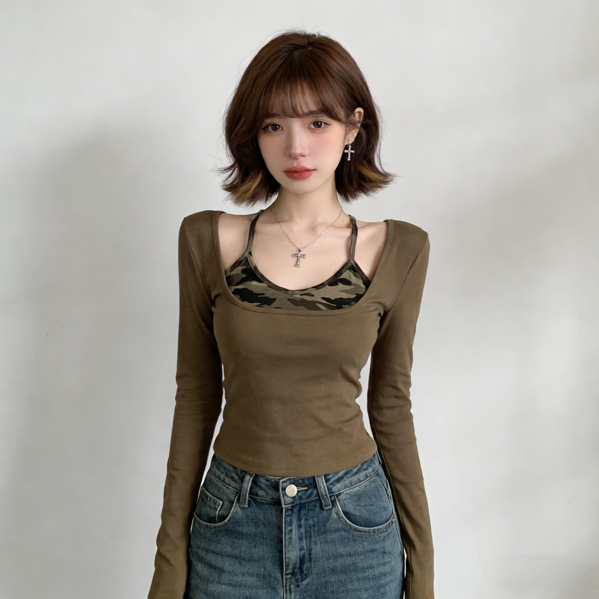BY13341# 早春带胸垫假两件镂空拼接迷彩t恤打底辣妹挂脖吊带短款上衣 服裝批發女裝批發服飾貨源
