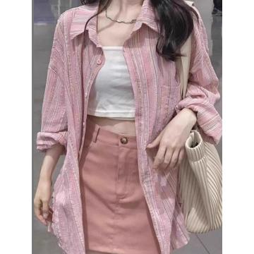新款早春装外搭开衫慵懒宽松上衣防晒衬衣粉色条纹衬衫外套女 服裝批發女裝批發服飾貨源