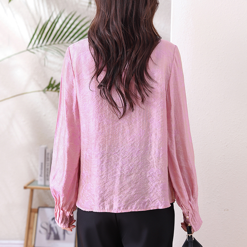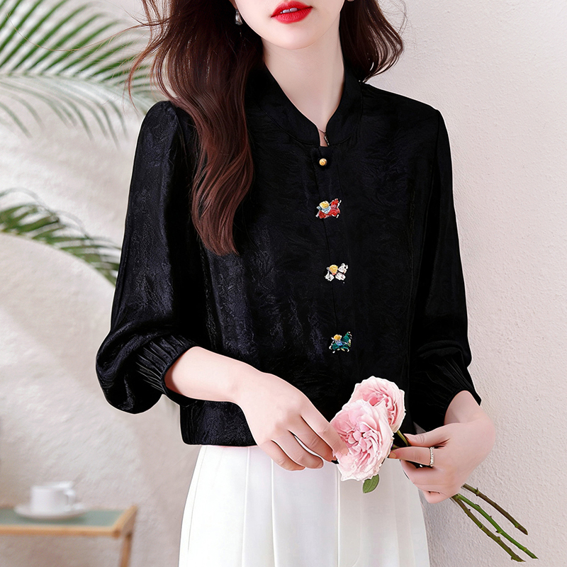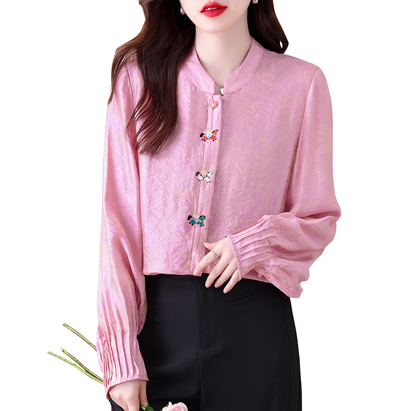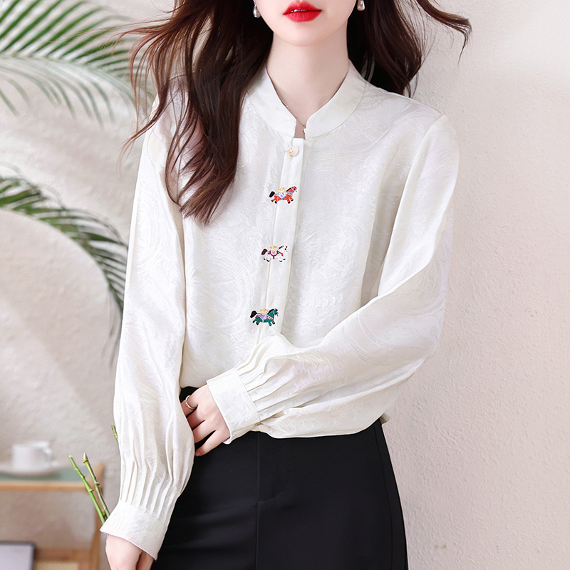 小马衬衫新款中式风立领刺绣提花衬衫女长袖宽松百搭气质上衣 服裝批發女裝批發服飾貨源