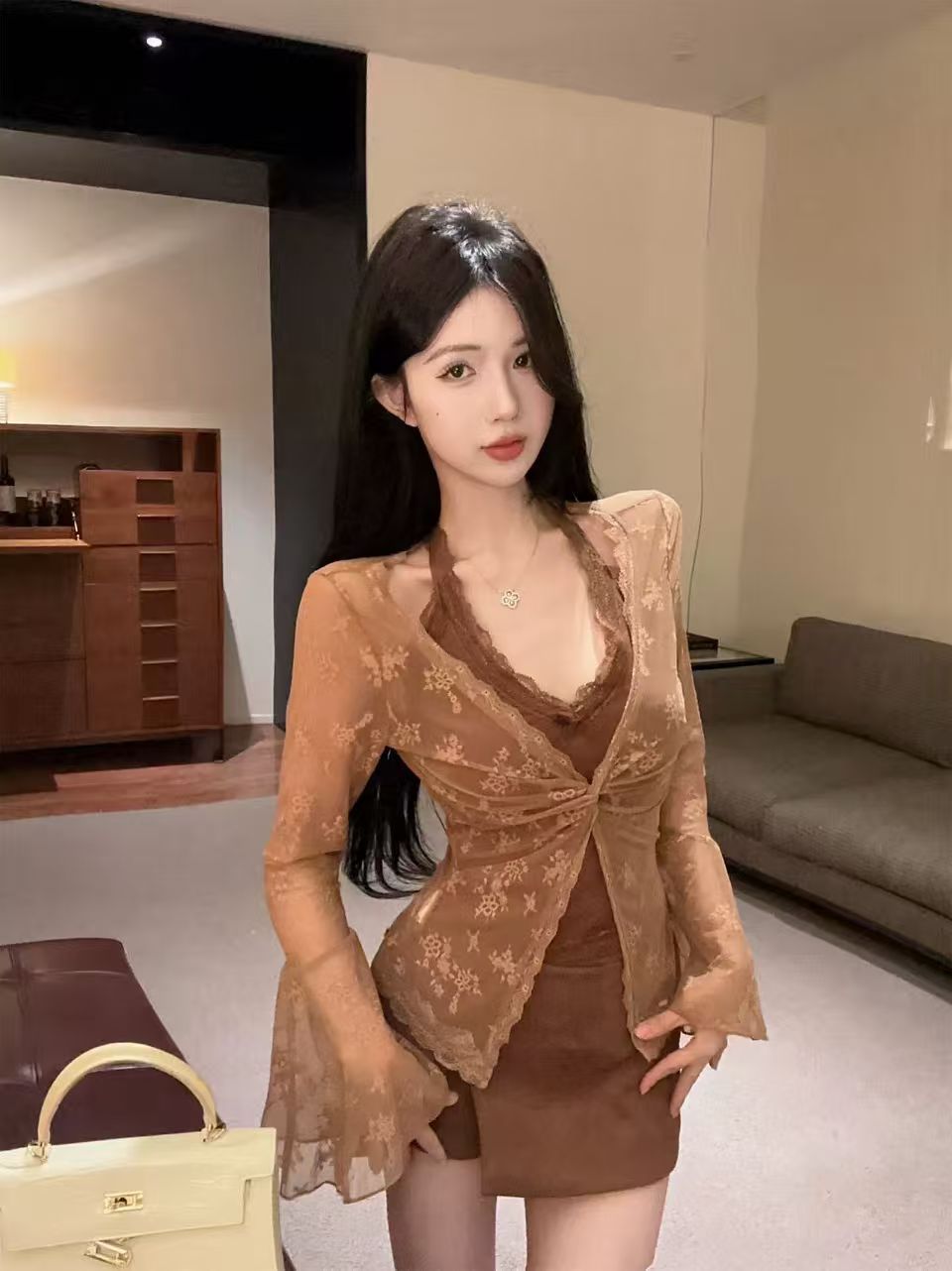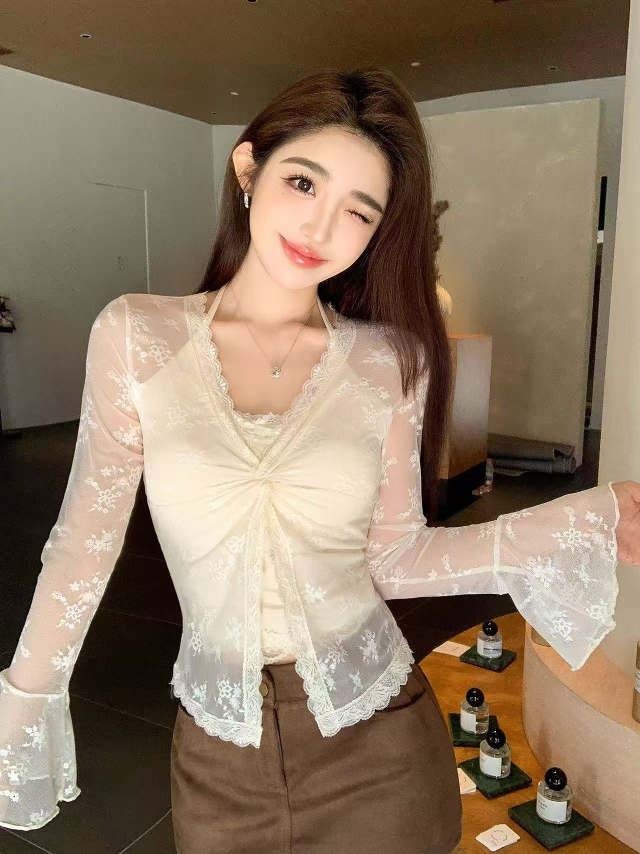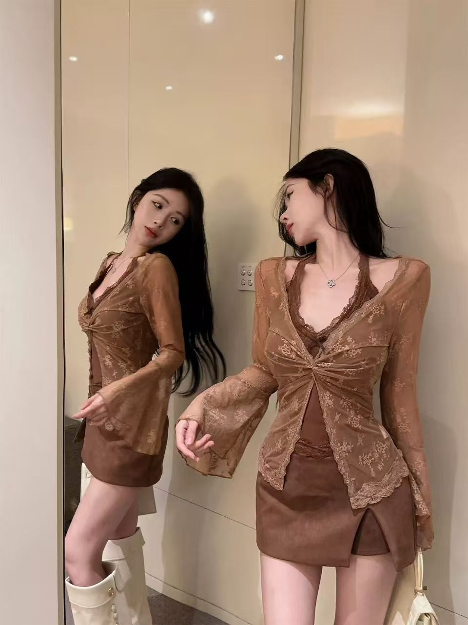带胸垫纯欲蕾丝长袖V领扭结喇叭袖假两件蕾丝衫上衣女 服裝批發女裝批發服飾貨源
