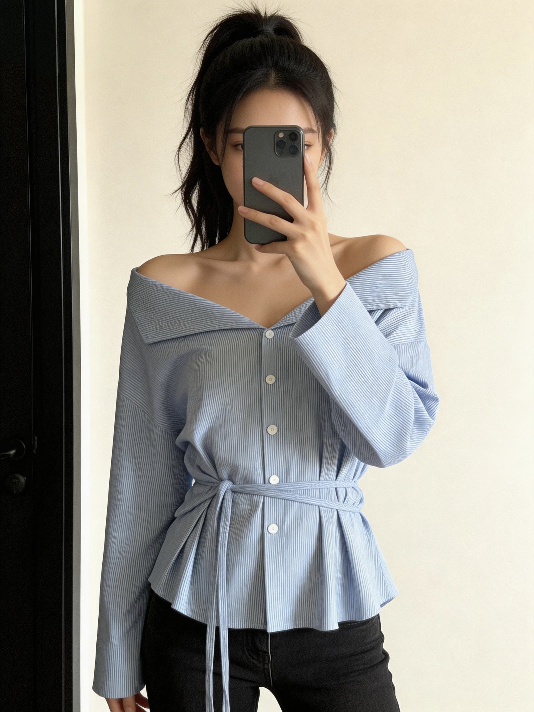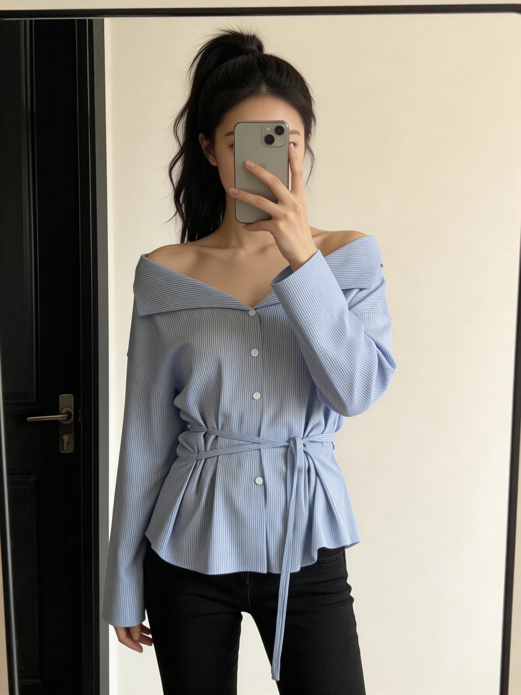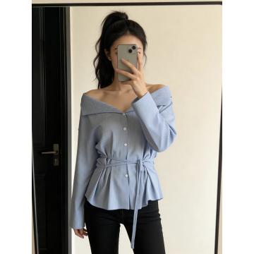 韩系蓝色长袖一字肩条纹衬衫女夏高级感独特绑带衬衣法式气质上衣 服裝批發女裝批發服飾貨源