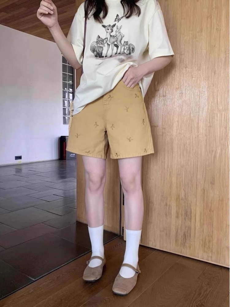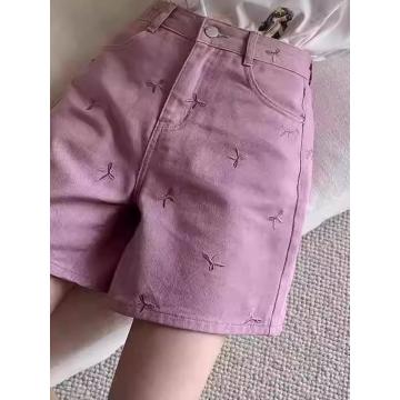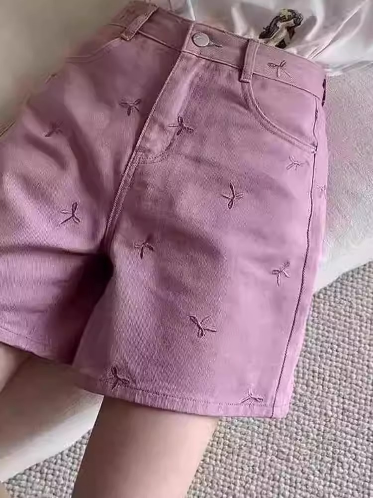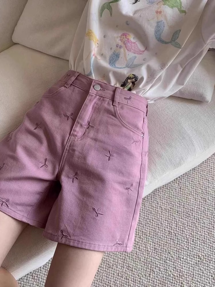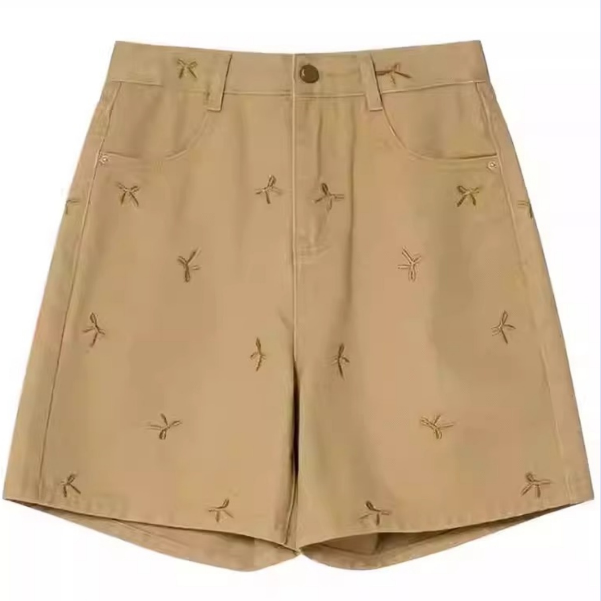 夏季新款蝴蝶结刺绣大码牛仔休闲短裤胖mm高腰百搭显瘦热裤女 服裝批發女裝批發服飾貨源