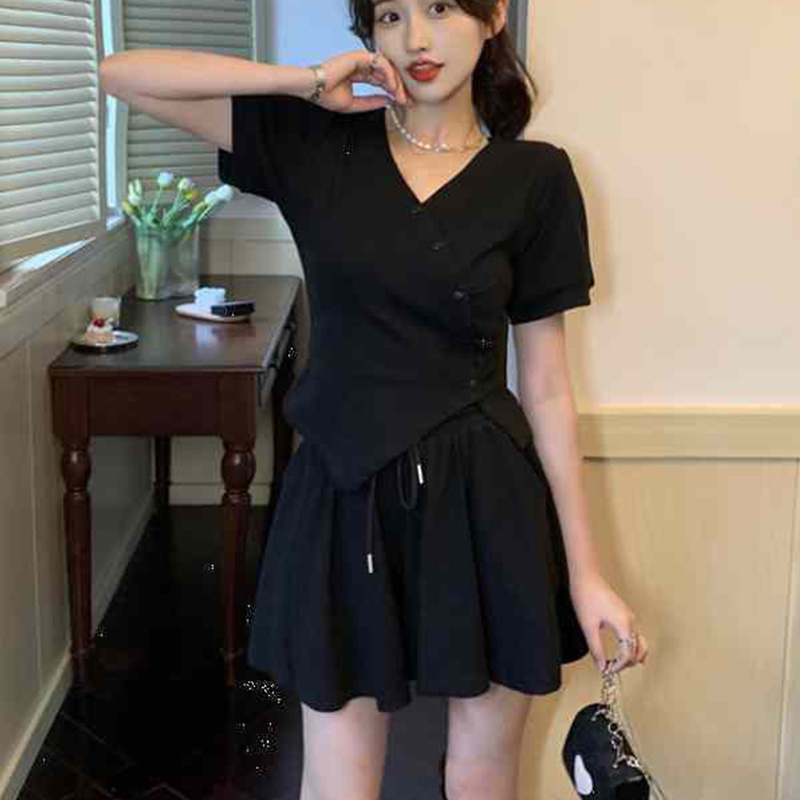 套装辣妹风不规则V领短袖T恤女夏季新款修身显瘦短款上衣两件套女 服裝批發女裝批發服飾貨源