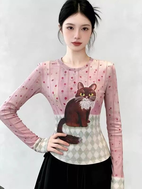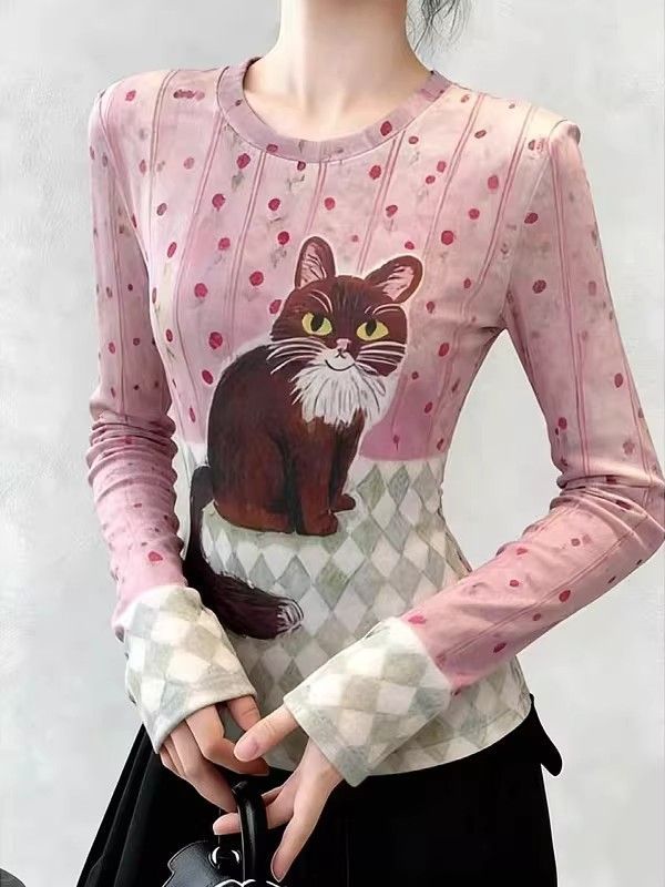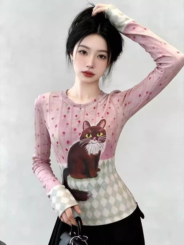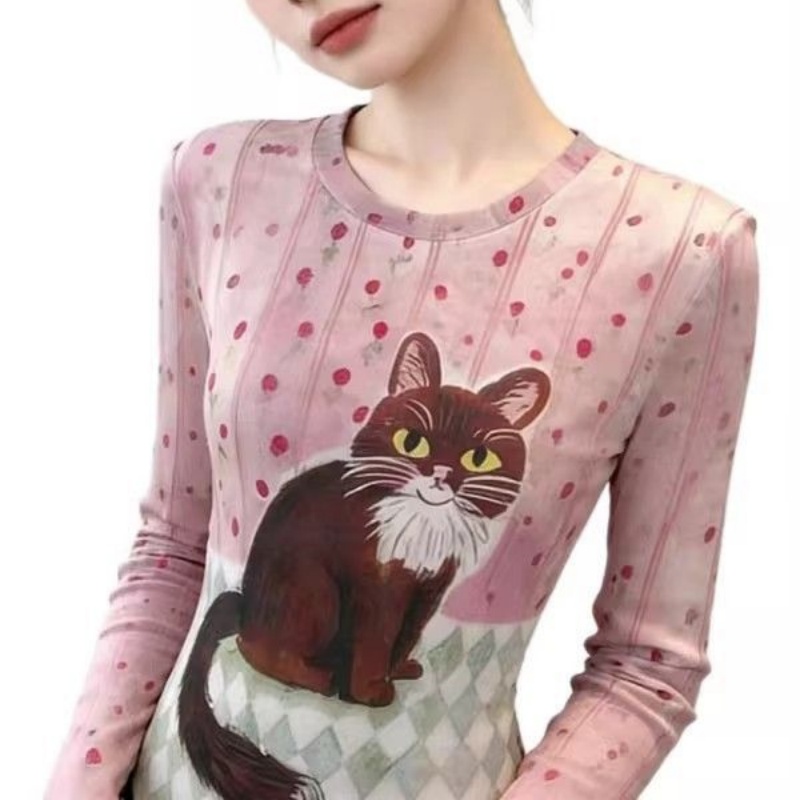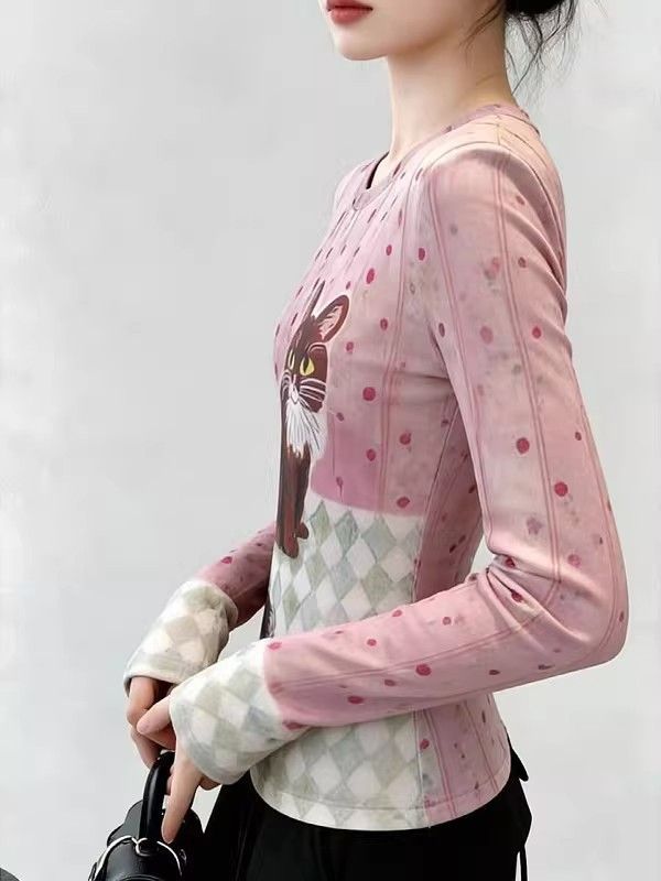 官拍大码胖小猫碎花双层网纱长袖t恤女夏季新款显瘦绝美底衫上衣 服裝批發女裝批發服飾貨源