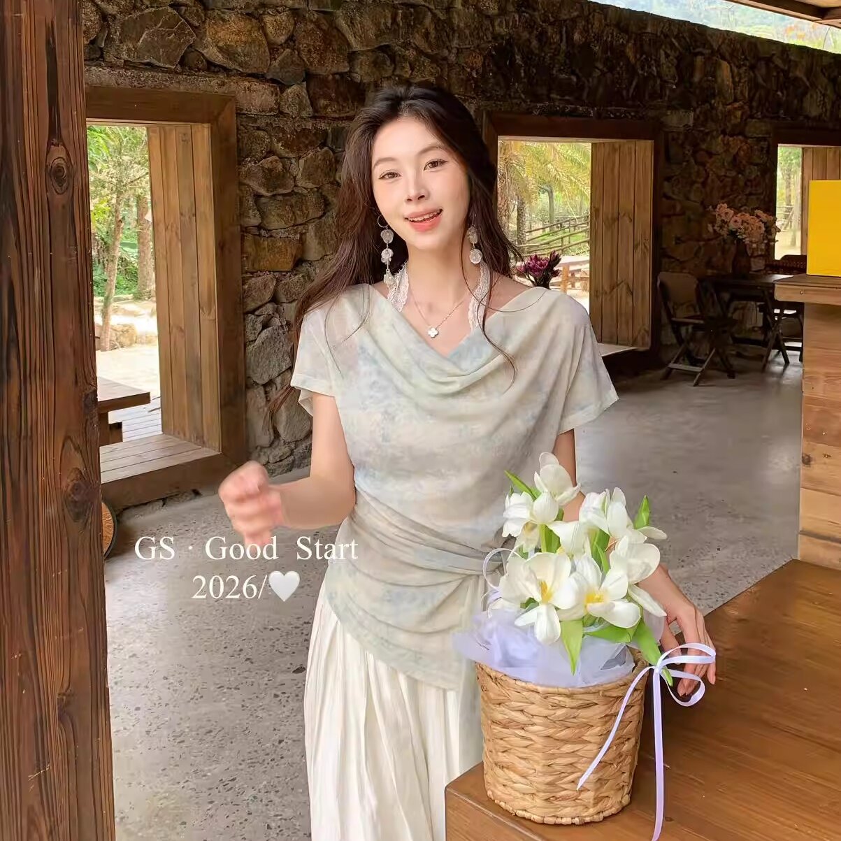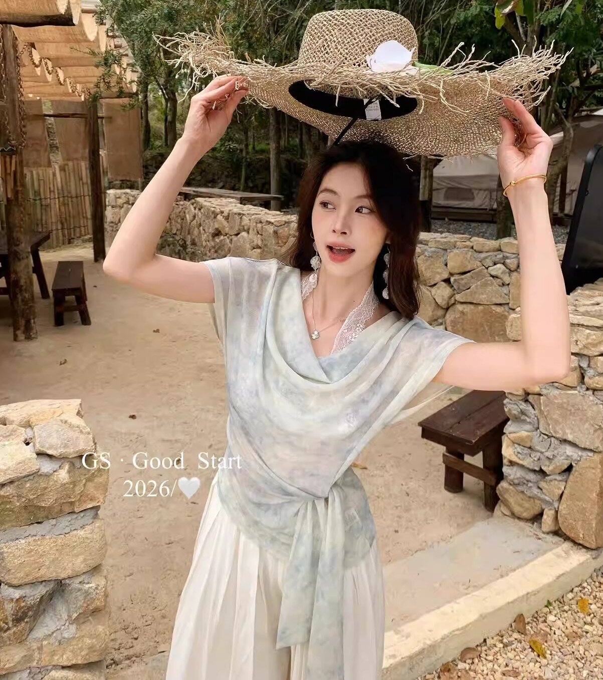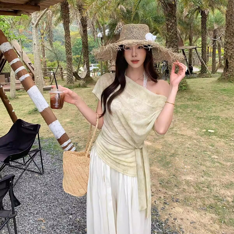 显瘦不挑人夏气质温柔扎染蕾丝拼接绑带假两件小衫 服裝批發女裝批發服飾貨源