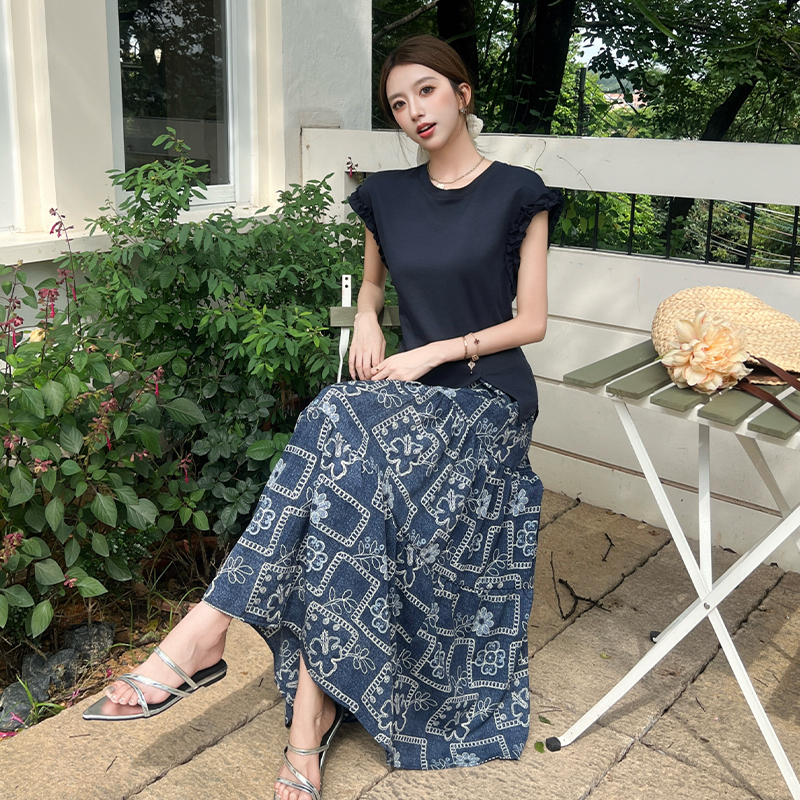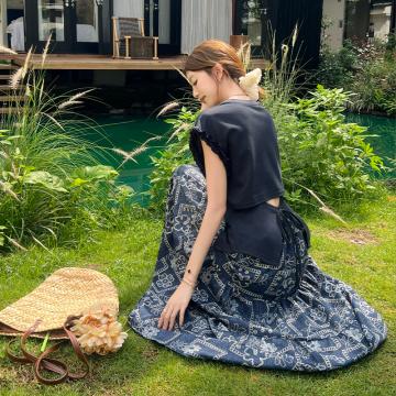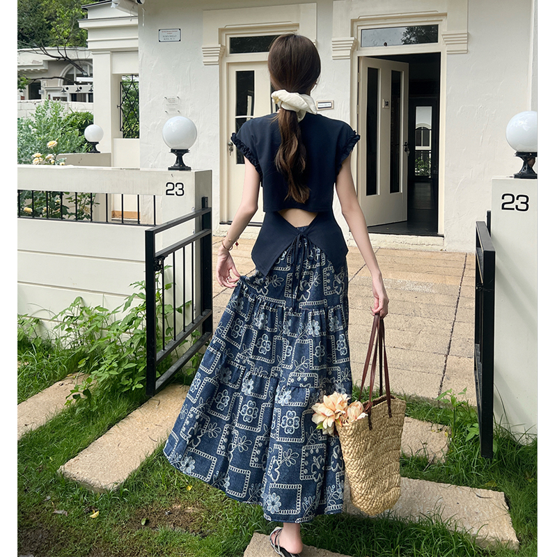 不规则下摆T恤木耳边后镂空系带上衣碎花大摆半身裙套装 服裝批發女裝批發服飾貨源