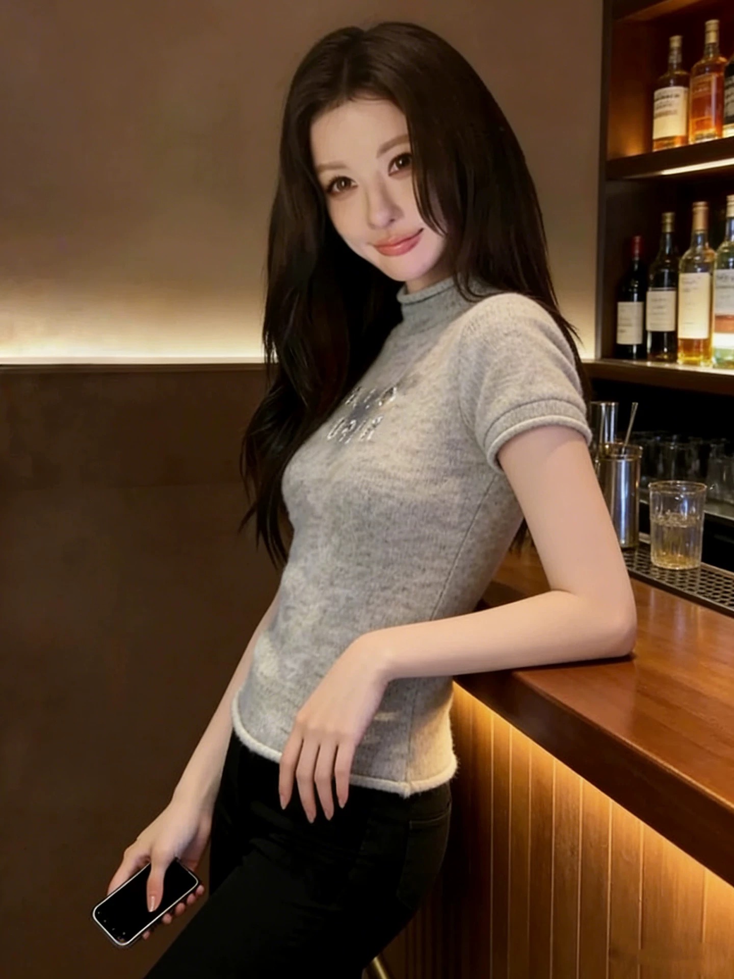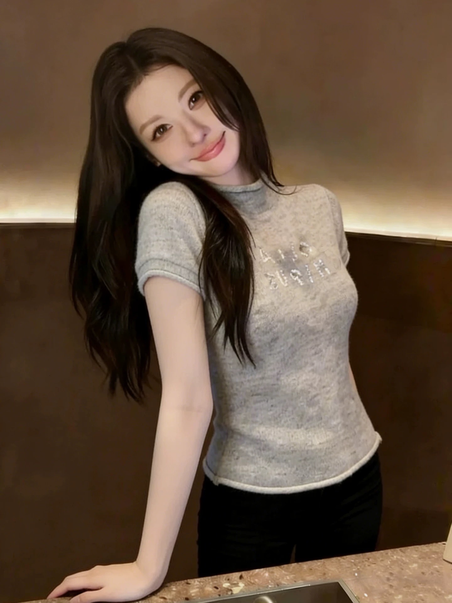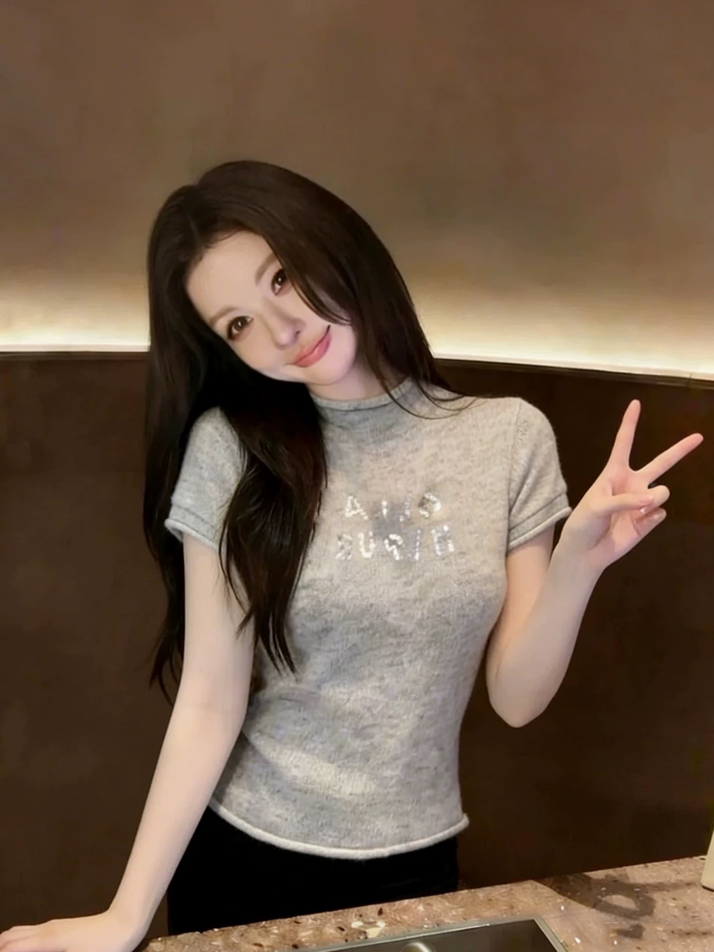 BY13870# 灰色半高领短袖针织衫女亮片字母设计感修身显瘦温柔风百搭上衣 服裝批發女裝批發服飾貨源