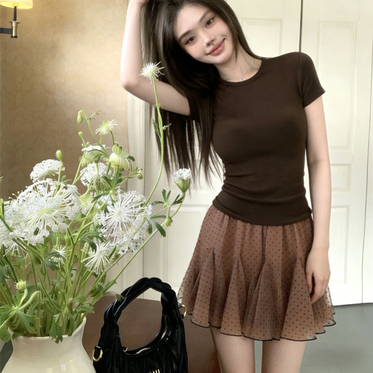 奶咖波点裙