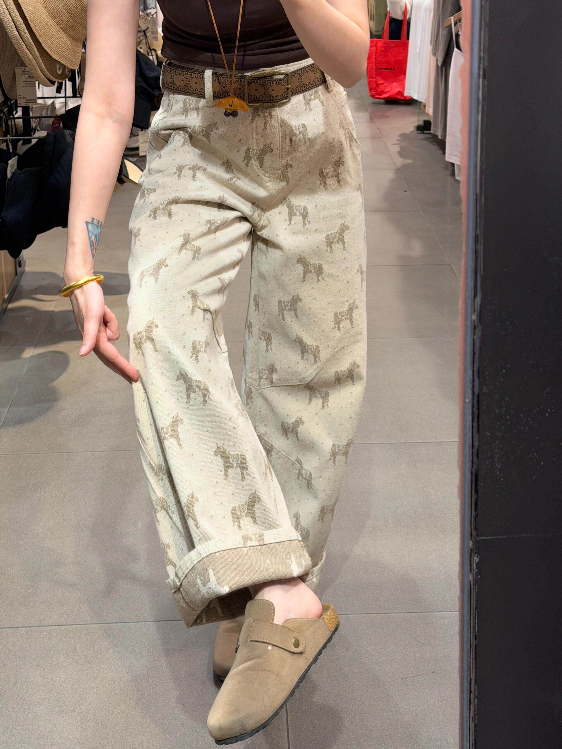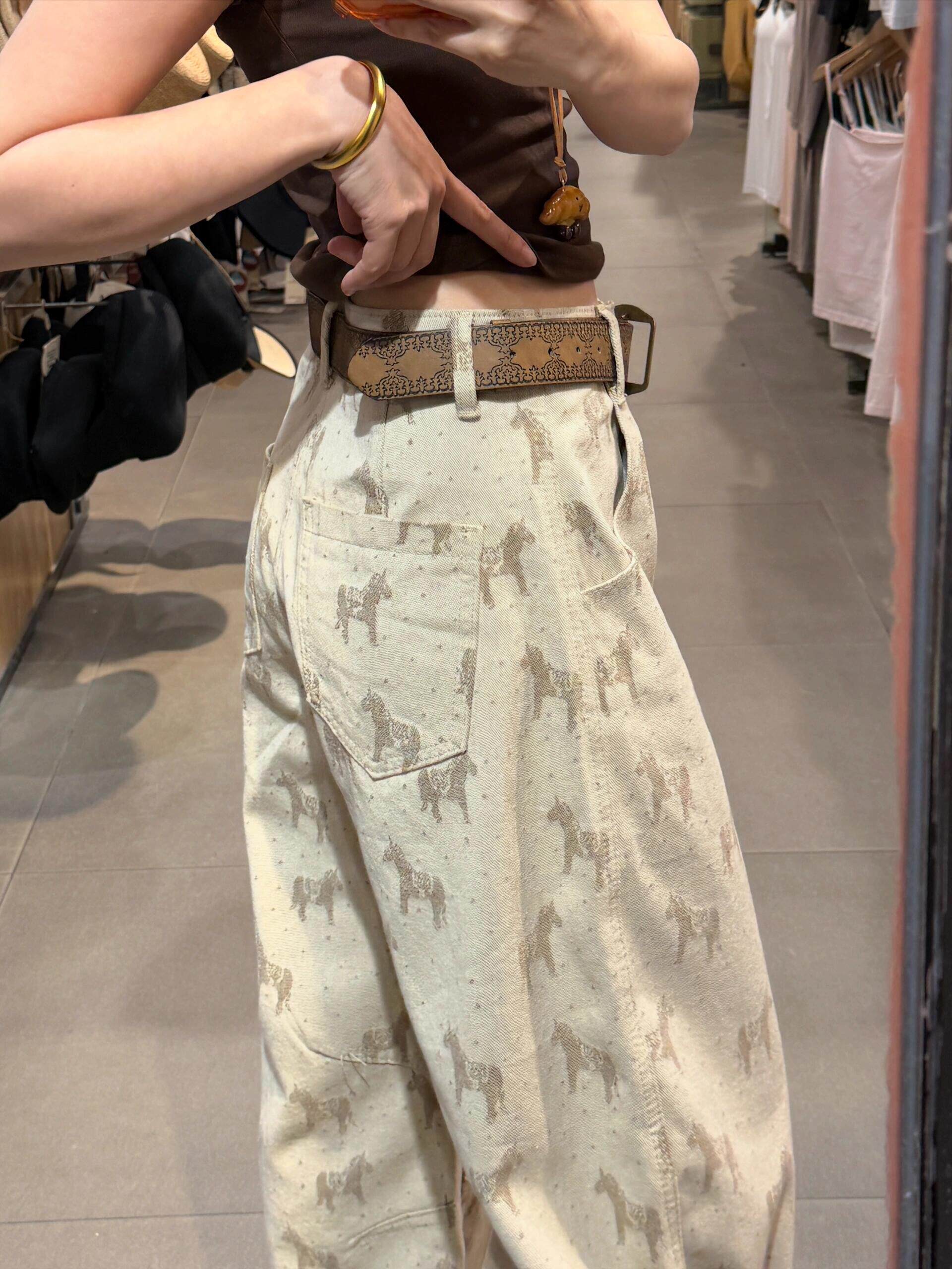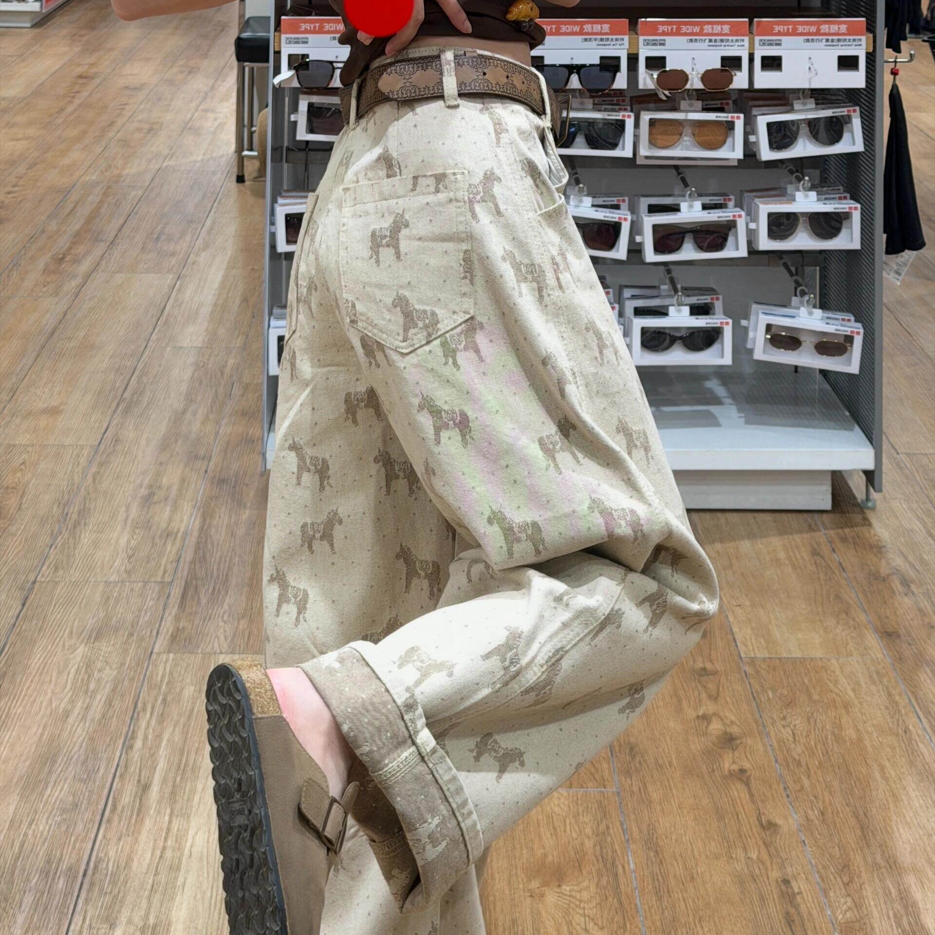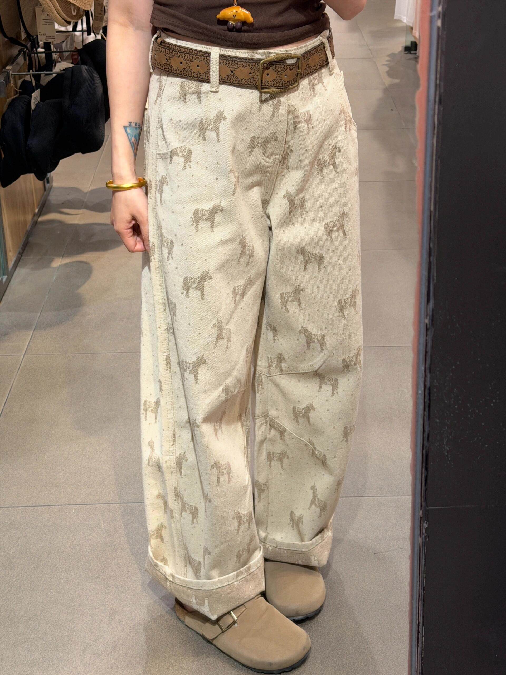 BY14487# 卡其色印花宽松直筒牛仔裤女夏季新款高腰显瘦休闲百搭窄版阔腿裤 服裝批發女裝批發服飾貨源