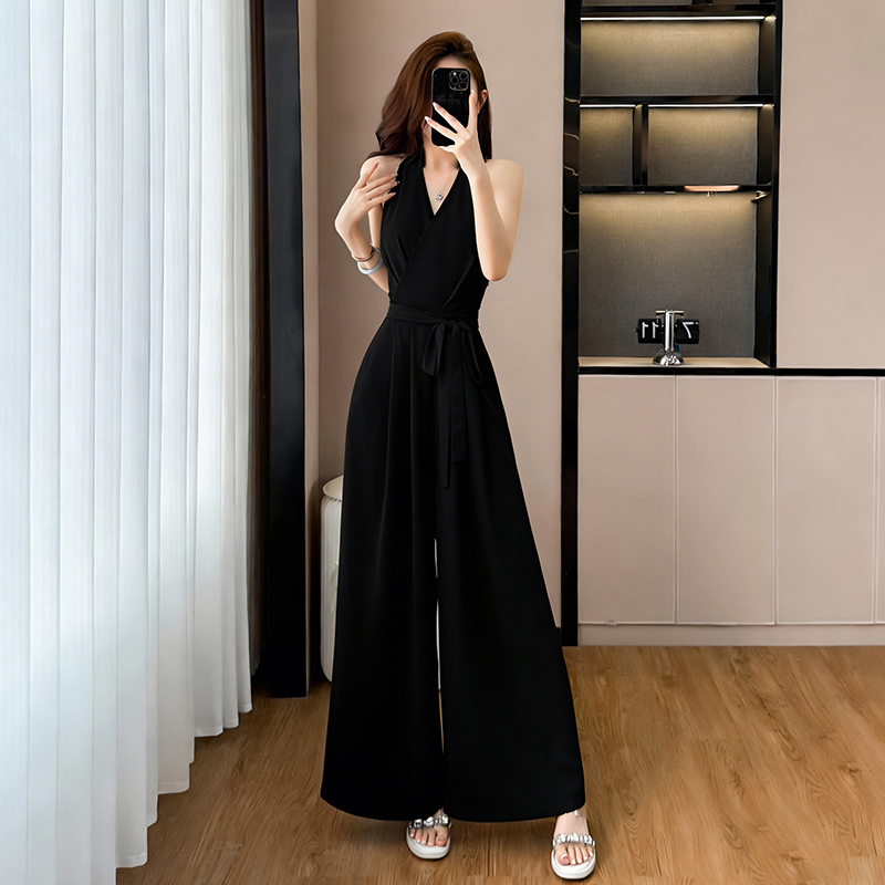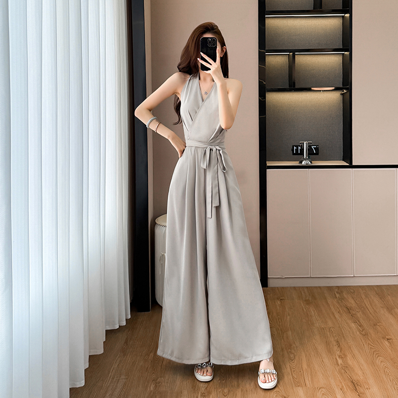 BY14504# 新款V领挂脖无袖连体裤女夏季休闲风收腰修身阔腿裤长裤 服裝批發女裝批發服飾貨源