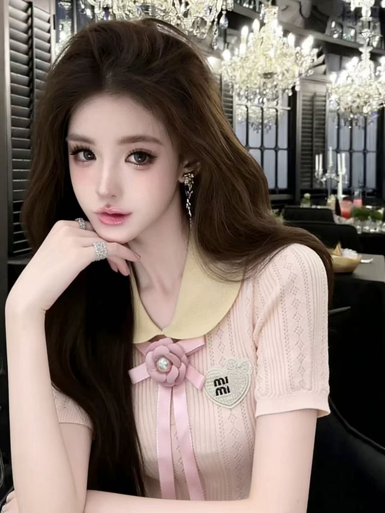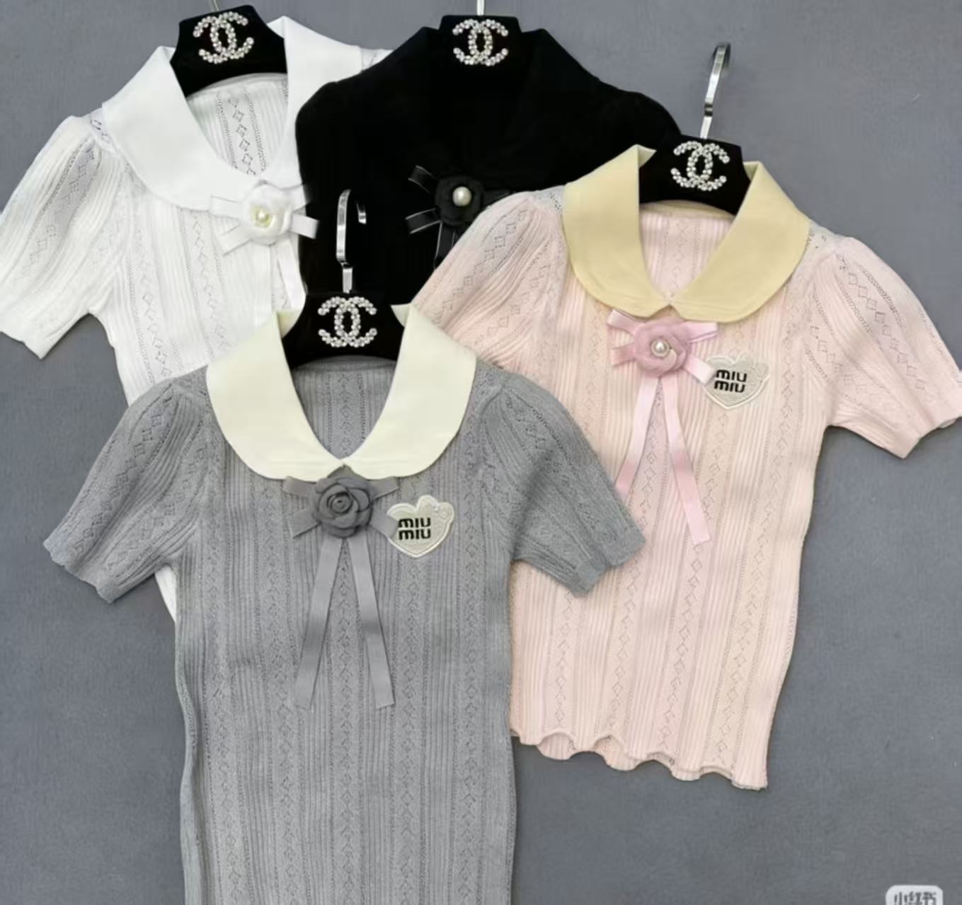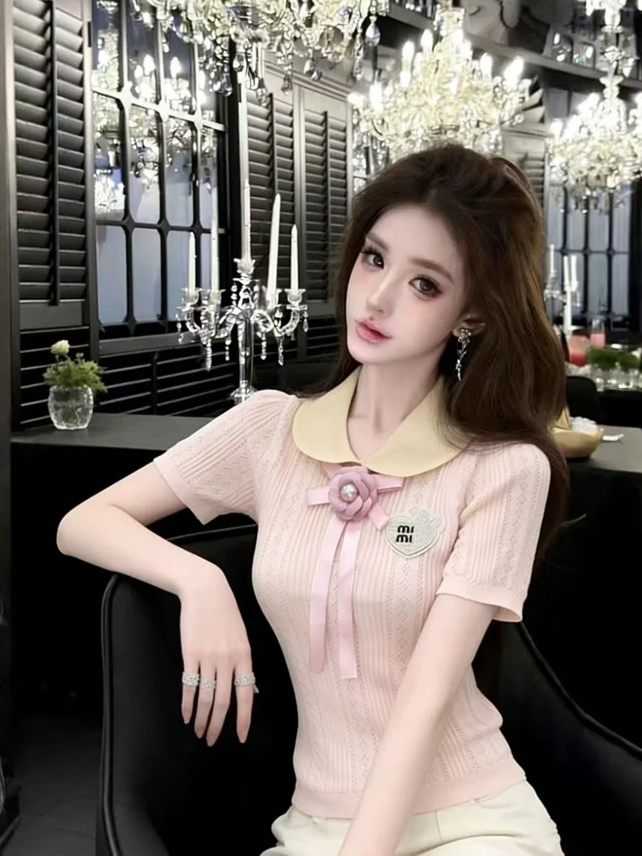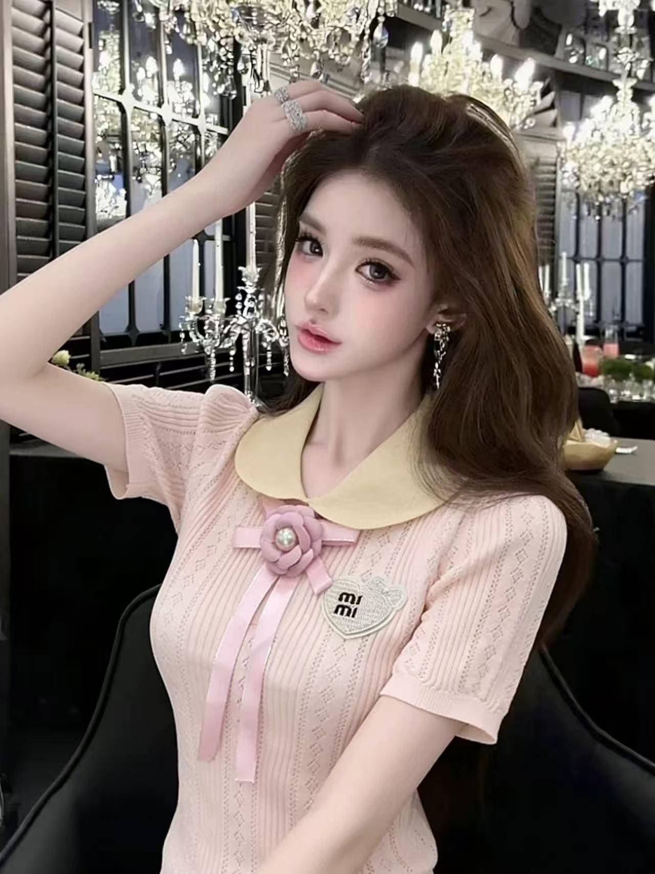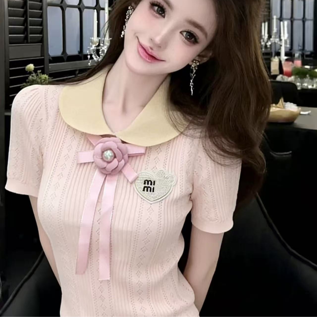 BY15035# LYMSTudio温柔韩系风翻领短袖针织衫女蝴蝶结气质上衣小香风 服裝批發女裝批發服飾貨源
