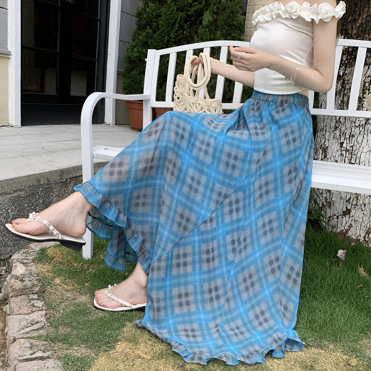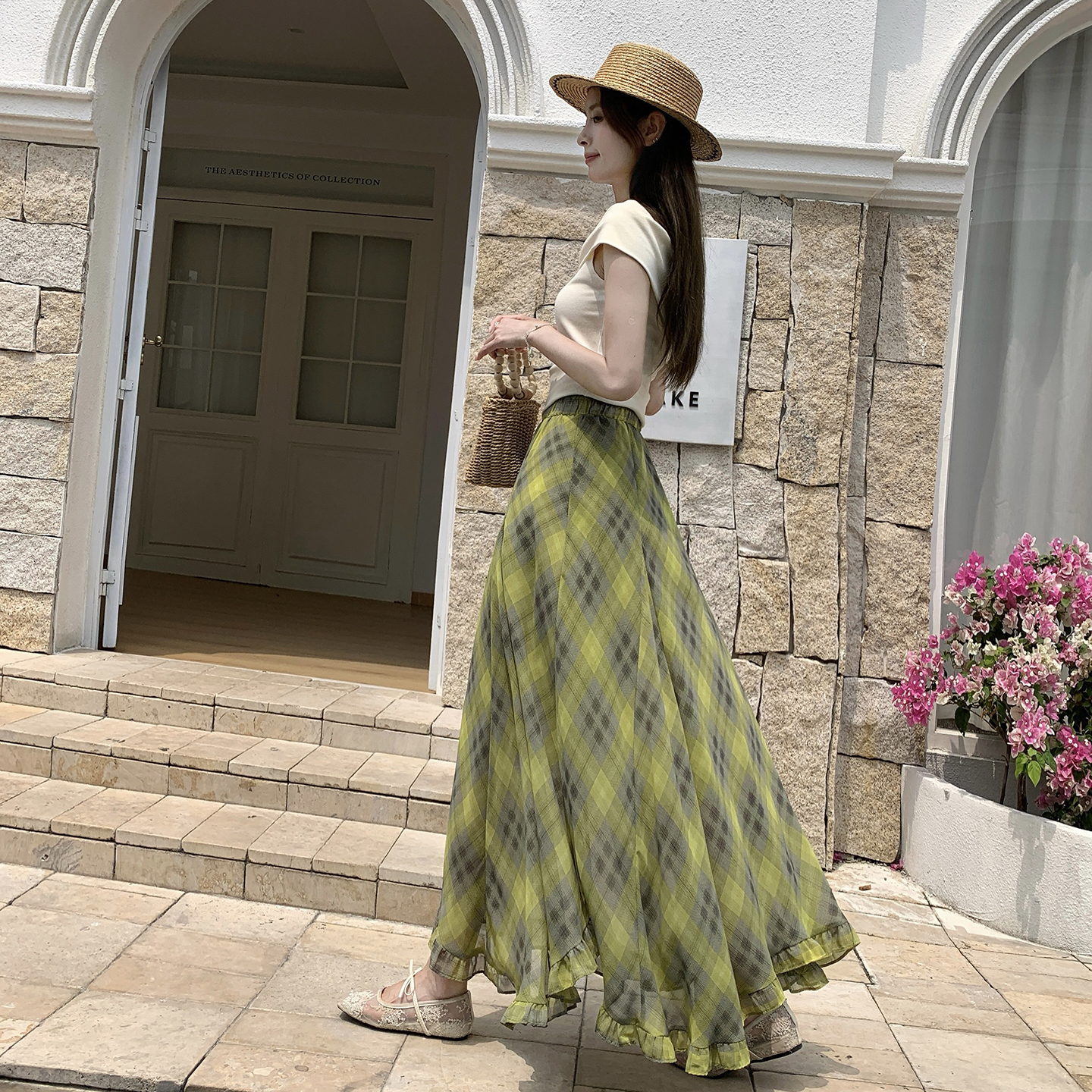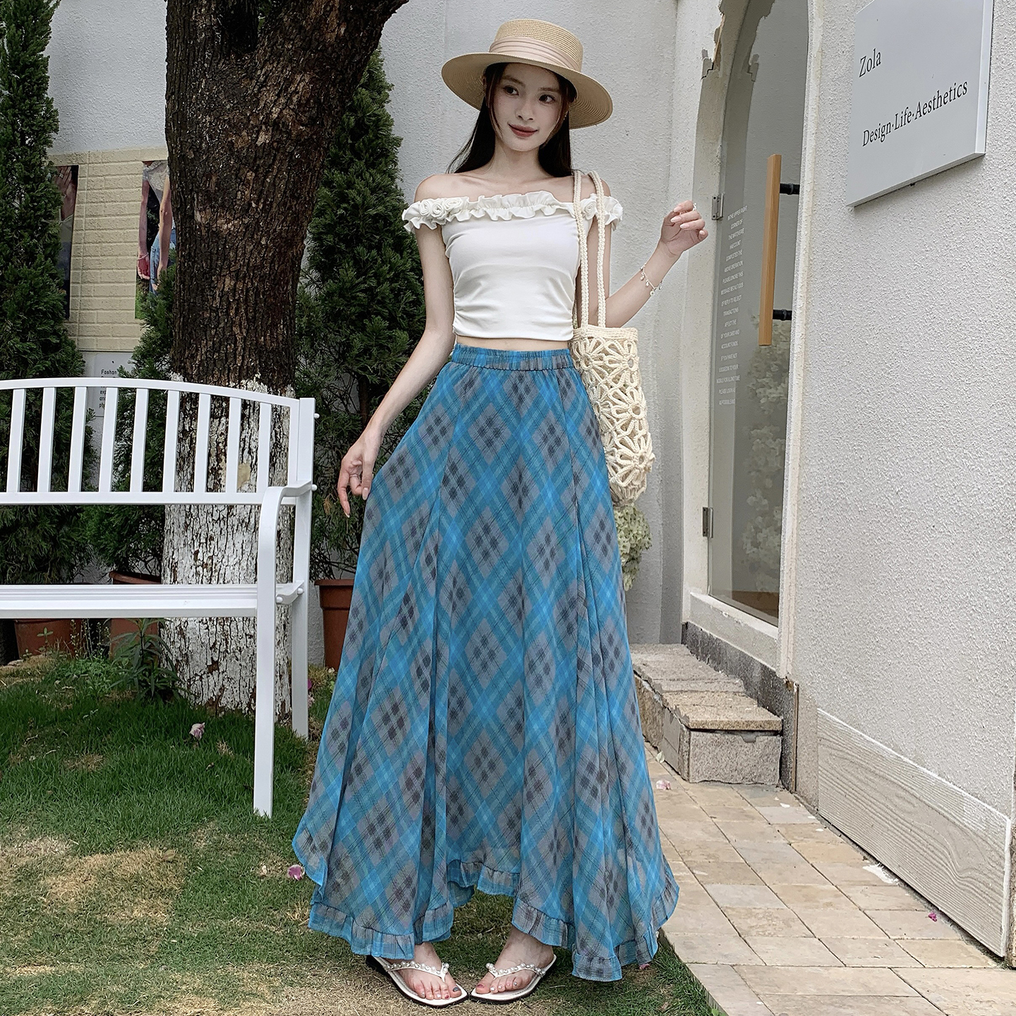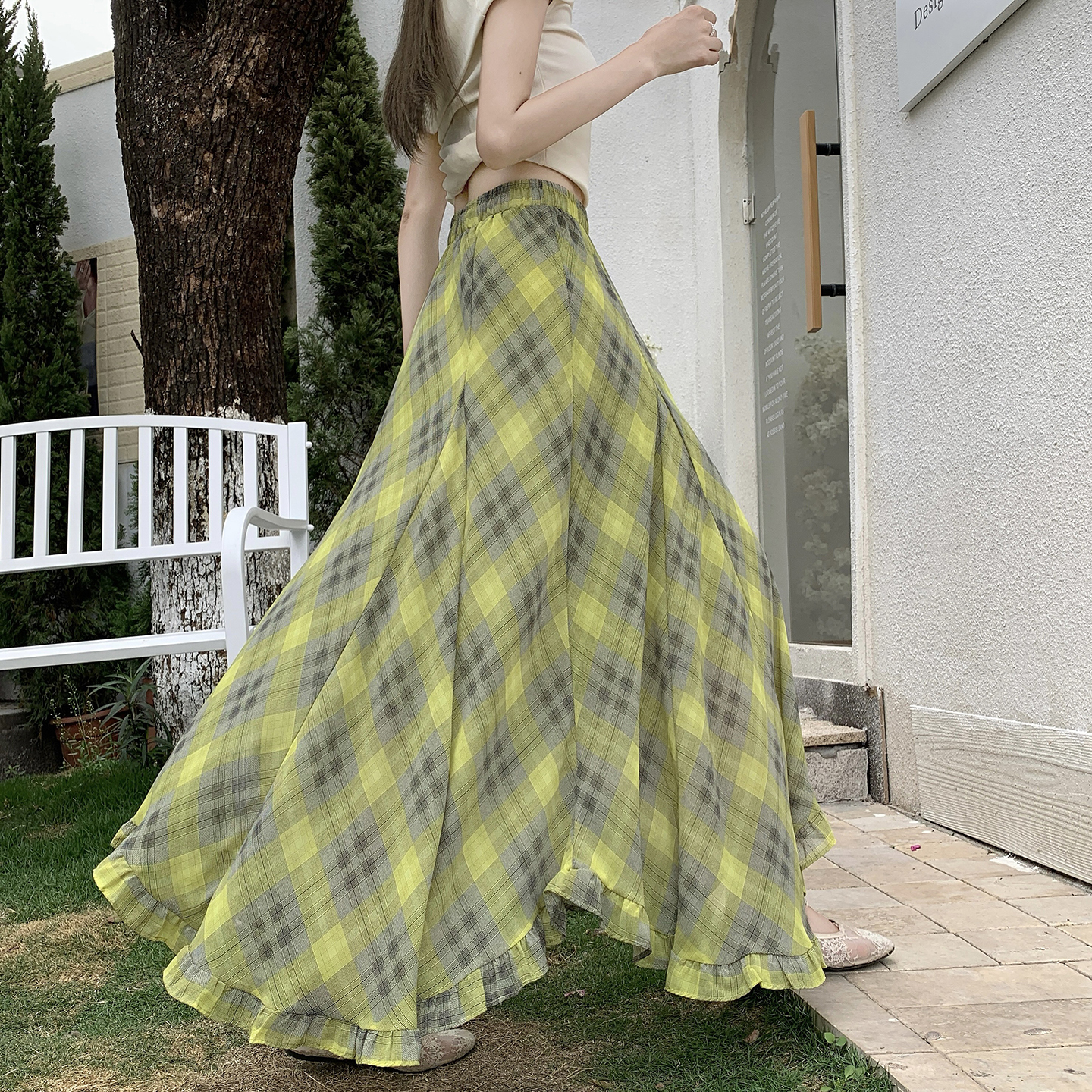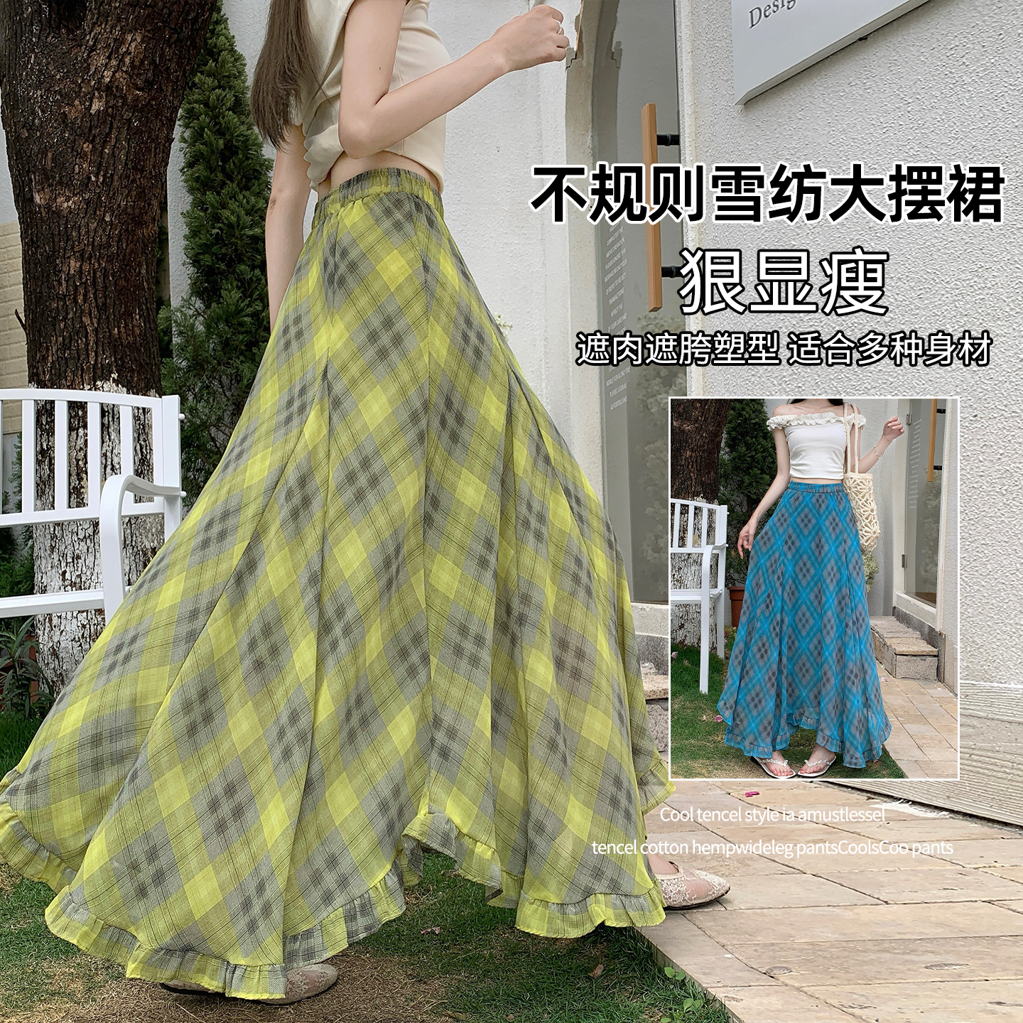 BY15568# 复古格纹不规则半身裙女夏季薄款高腰遮胯百搭大摆A字中长裙 服裝批發女裝批發服飾貨源