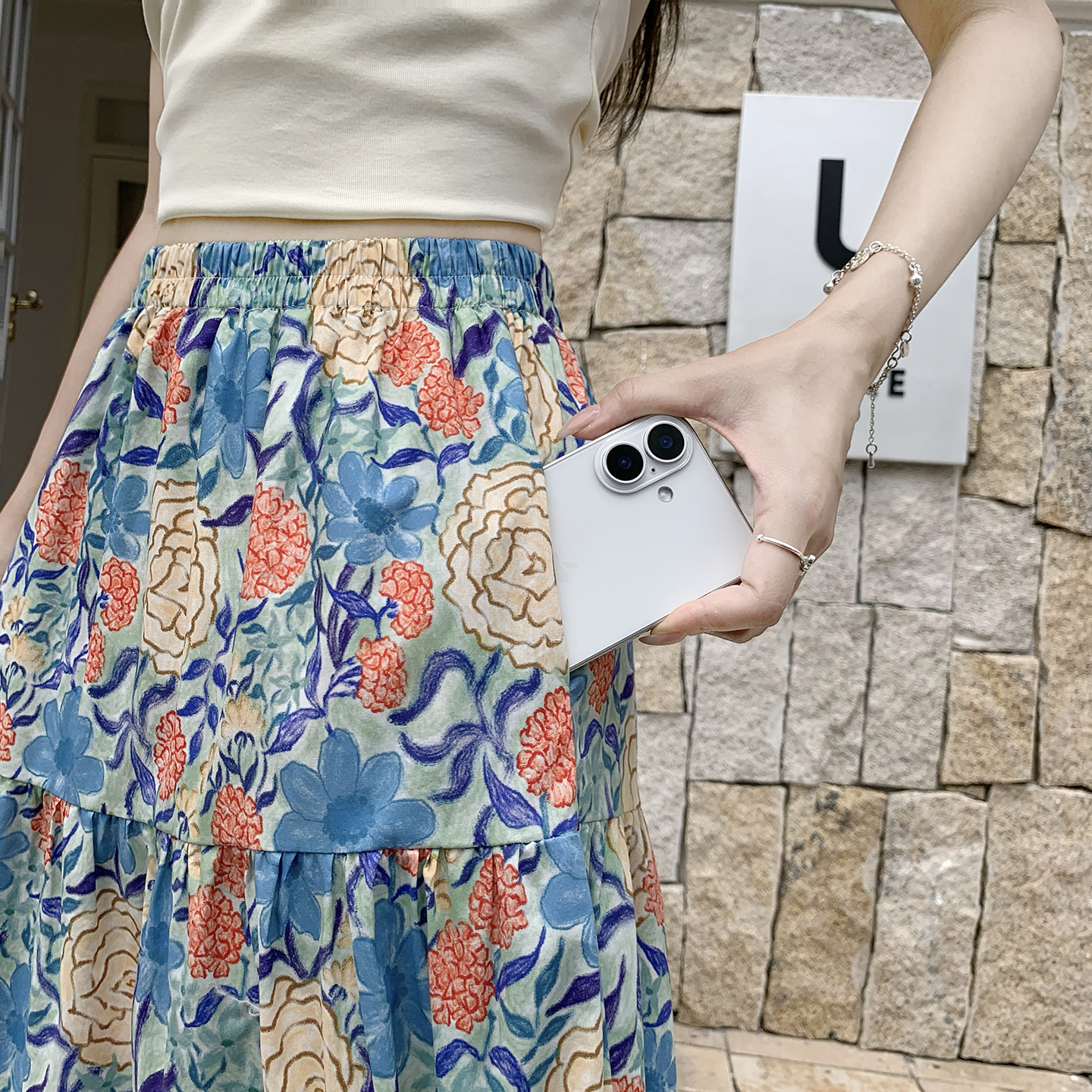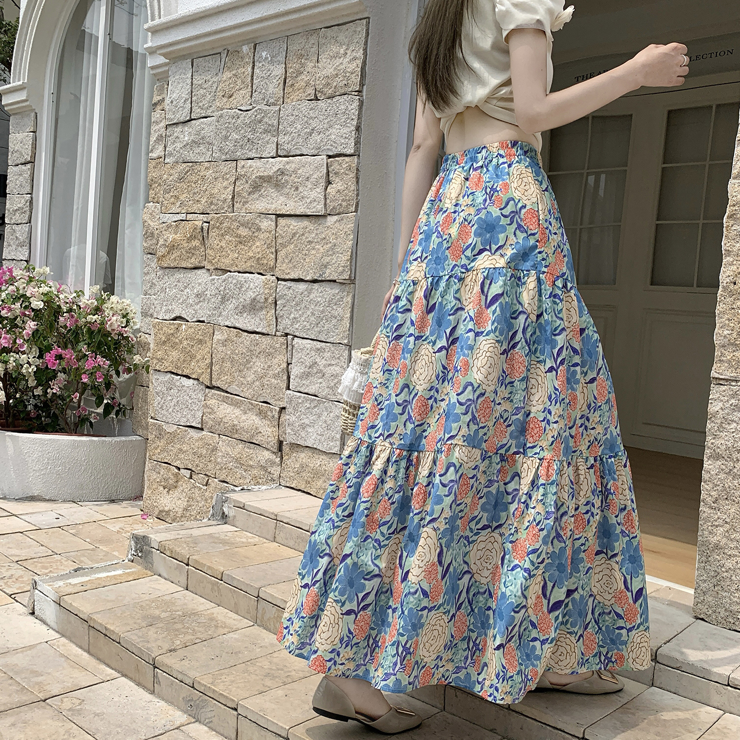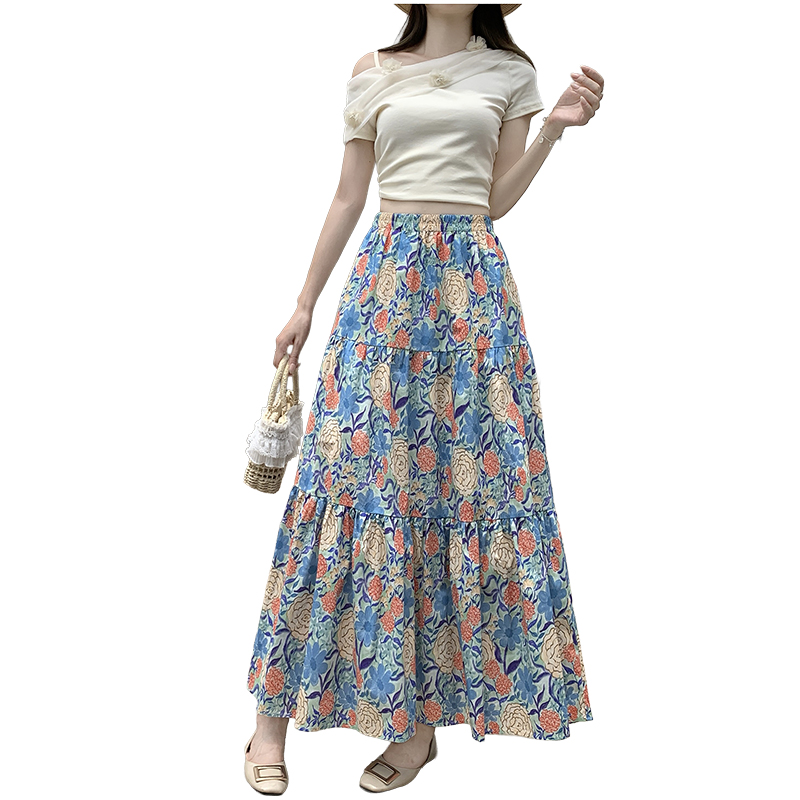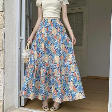 BY15571# 油画风花朵印花半身裙女夏高腰减龄松紧腰拼接蛋糕裙A字伞裙 服裝批發女裝批發服飾貨源