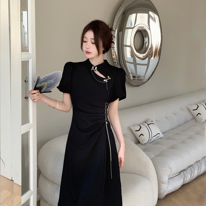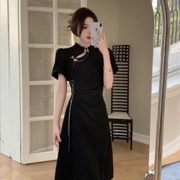 BY15855# 新中式改良旗袍连衣裙女夏季蝴蝶扣国风禅意气质显瘦小黑裙 服裝批發女裝批發服飾貨源