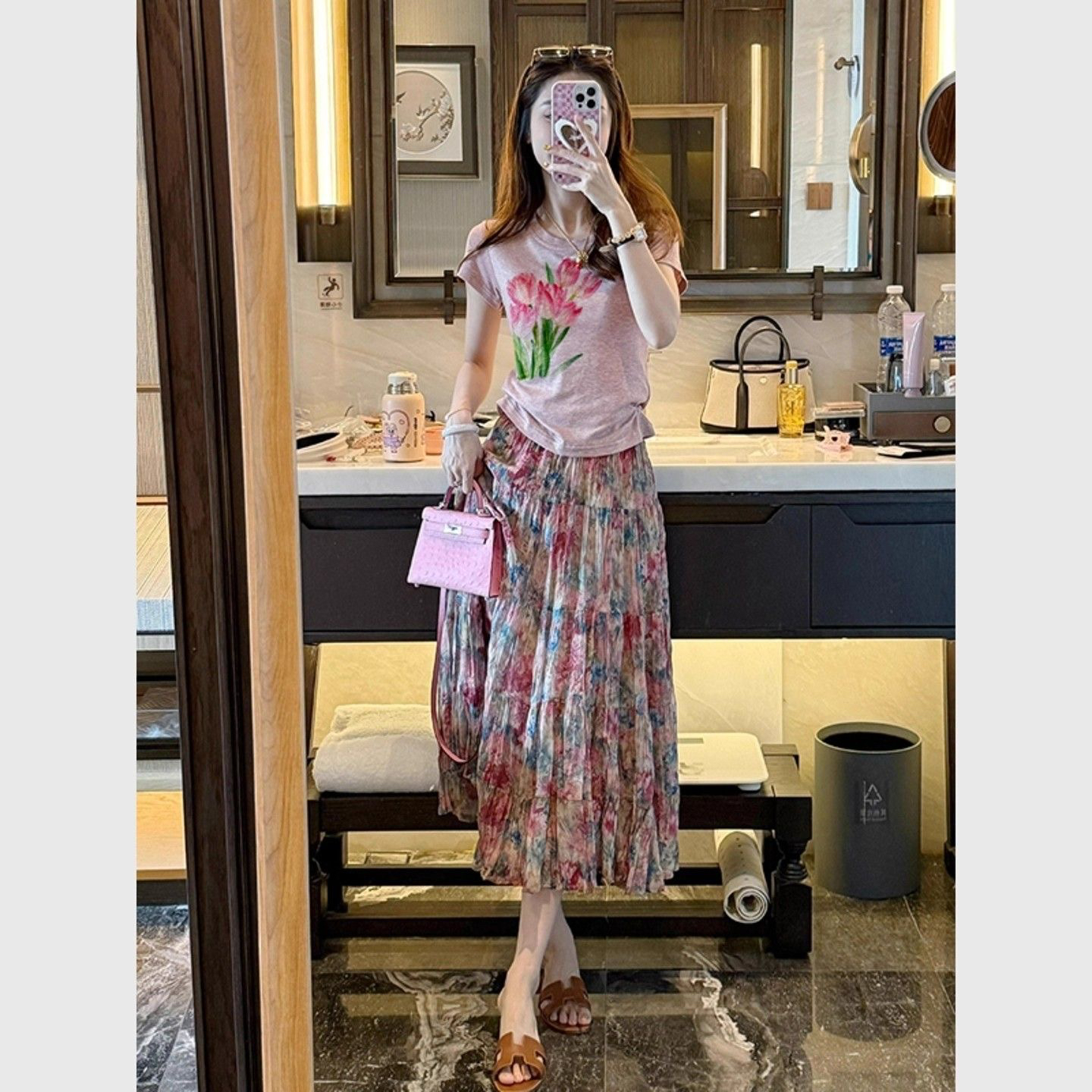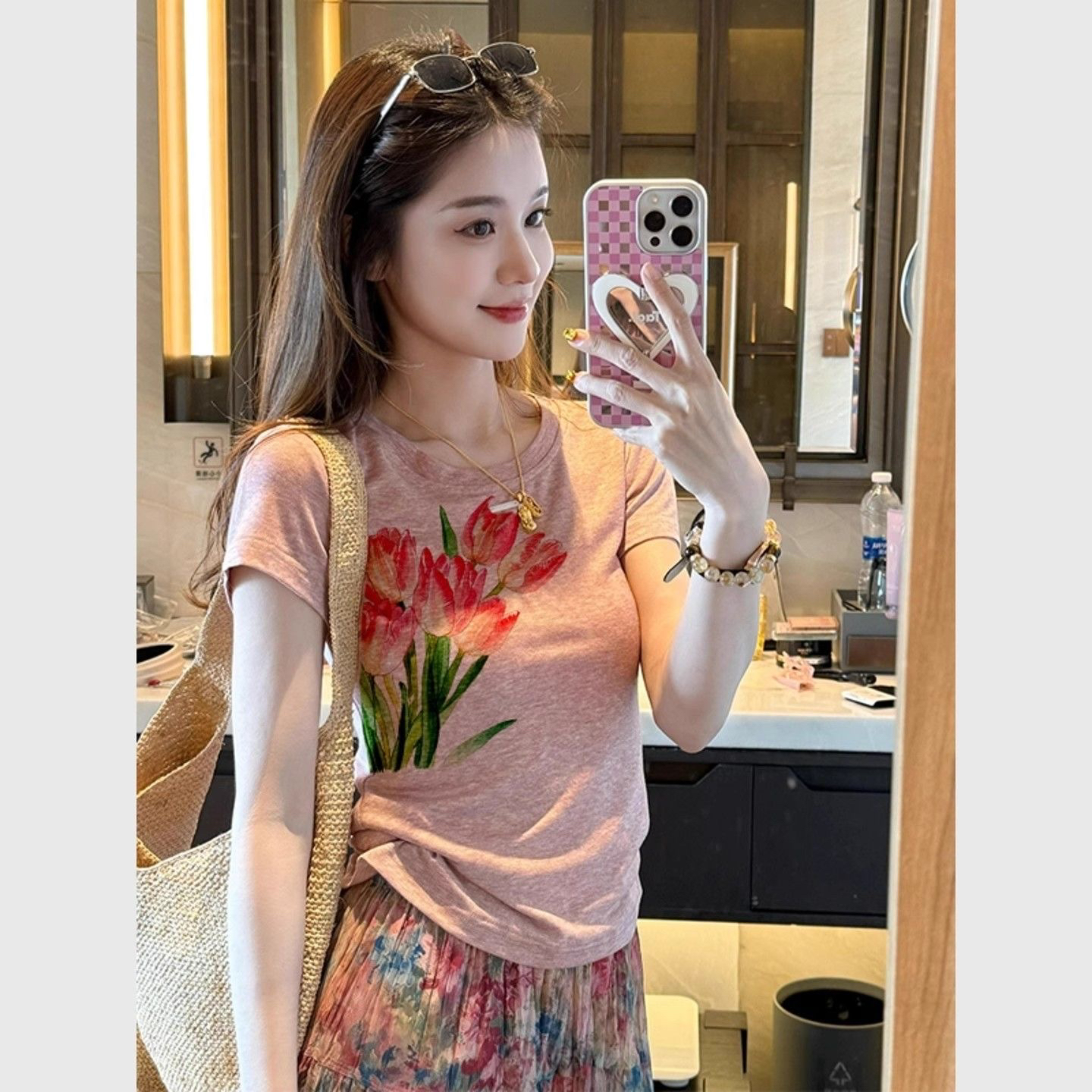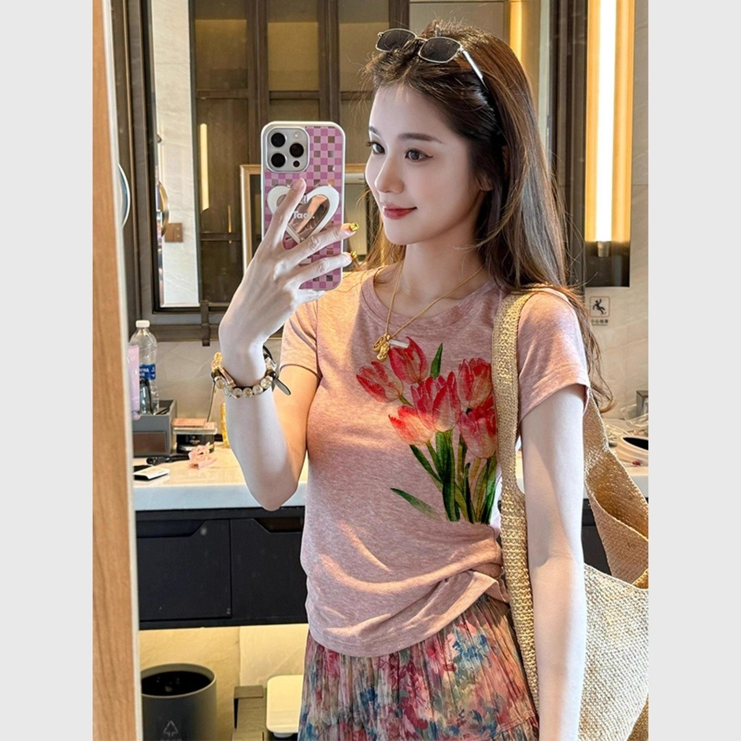 BY16140# 粉色郁金香印花短袖女正肩t恤超火减龄设计感夏天巨好看上衣 服裝批發女裝批發服飾貨源