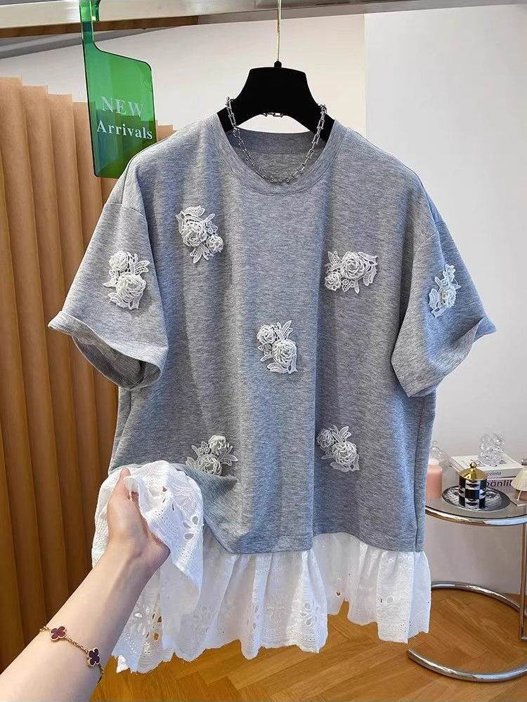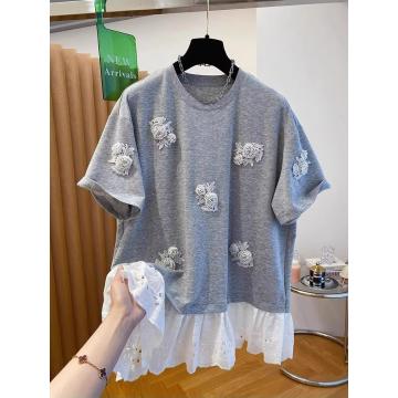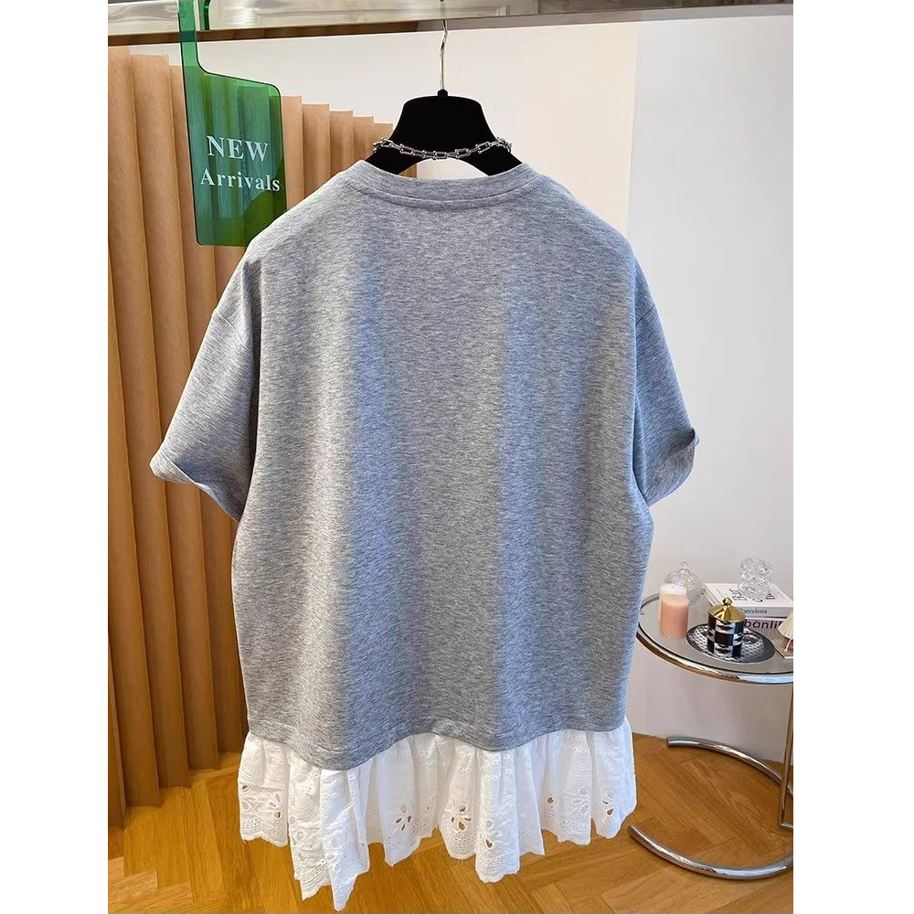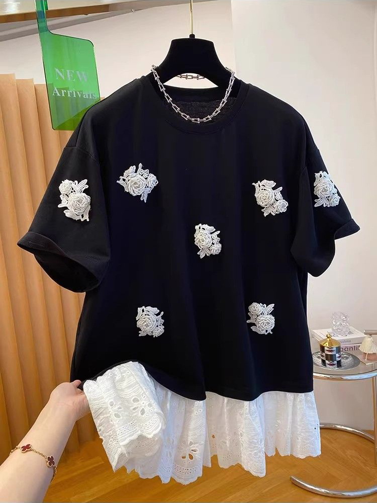 BY16240# 深圳南油高端欧货钉珠t恤女短袖宽松别致独特蕾丝拼接假两件上衣 服裝批發女裝批發服飾貨源