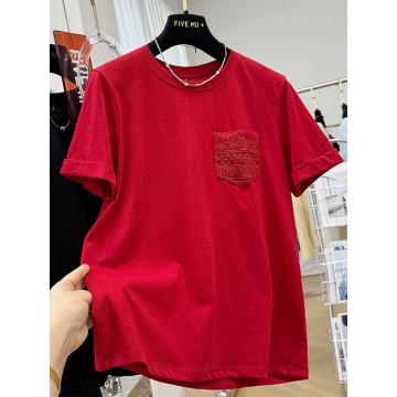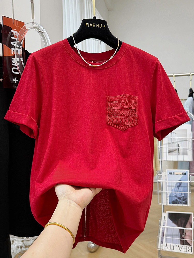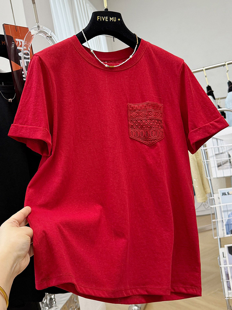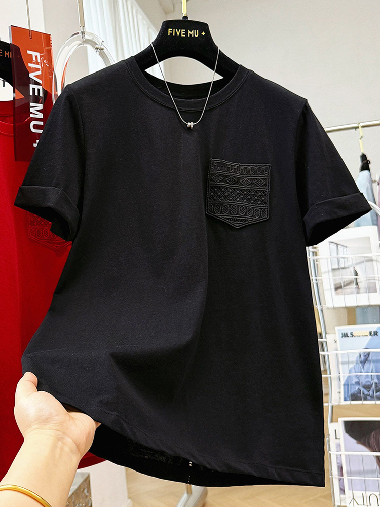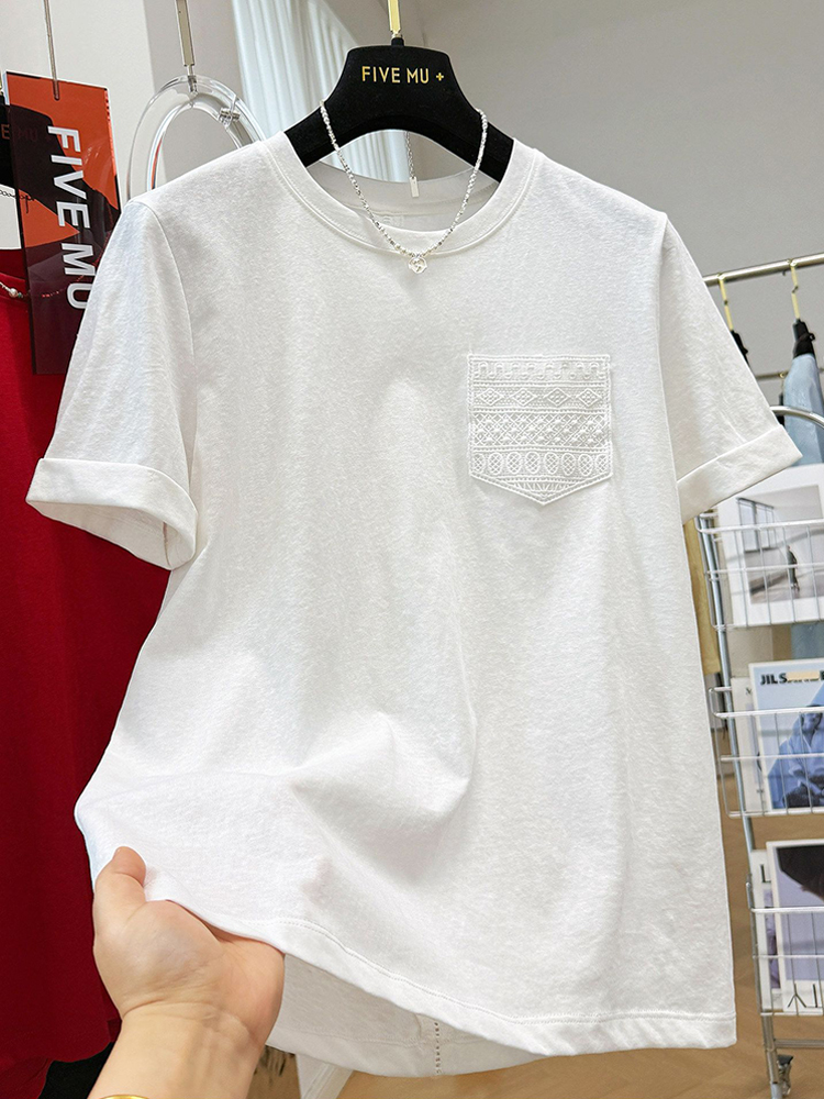 BY16243# 韩系蕾丝口袋正肩短袖t恤女夏巨好看打底衣女内搭高级感可外穿 服裝批發女裝批發服飾貨源