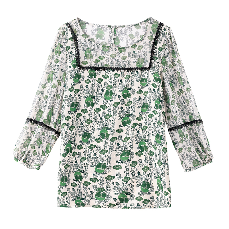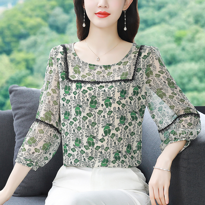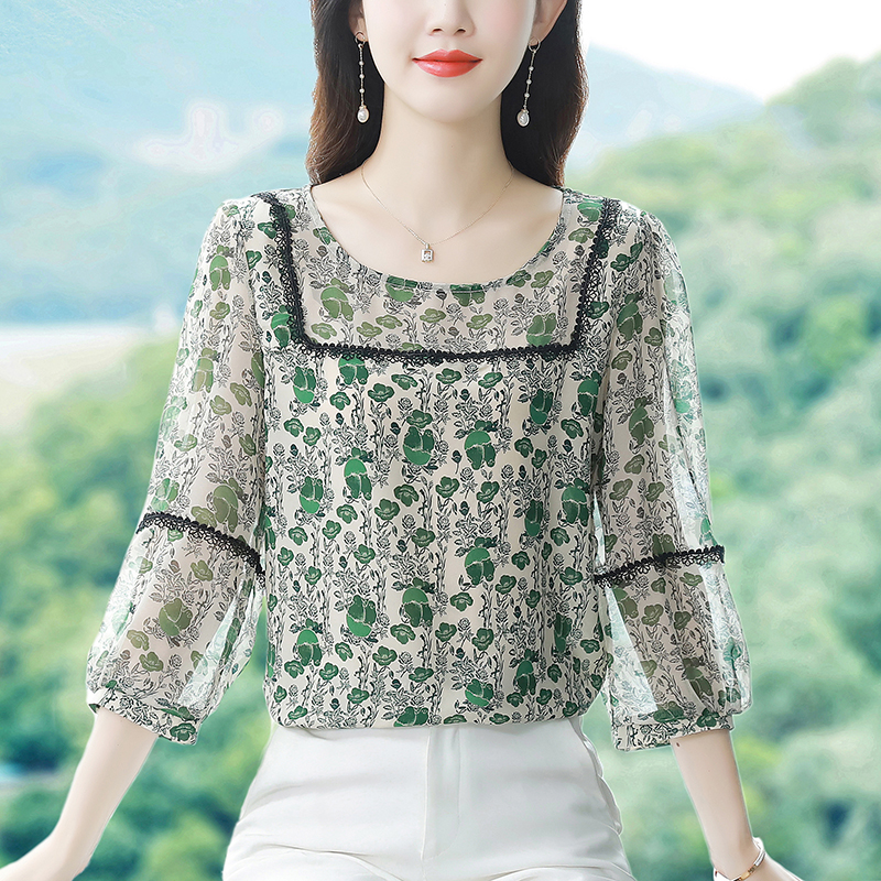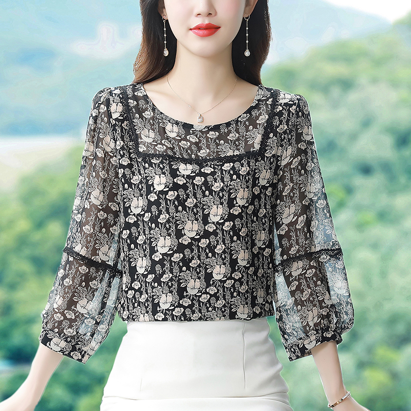BY17371# 早秋新款印花圆领宽松真丝雪纺衫减龄七分袖上衣