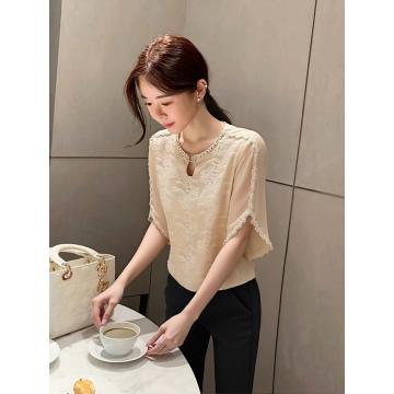 Home > 短袖雪纺衫、衬衫、上衣 > 香槟色衬衫女春夏轻奢高端洋气独特别致巨好看新中式提花缎面上衣 服裝批發女裝批發服飾貨源