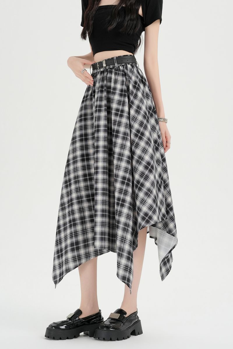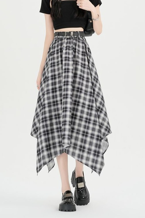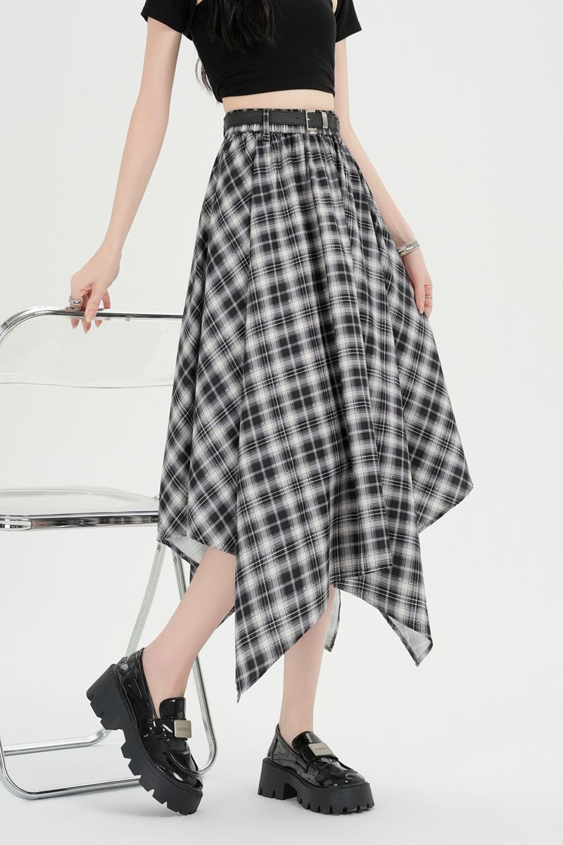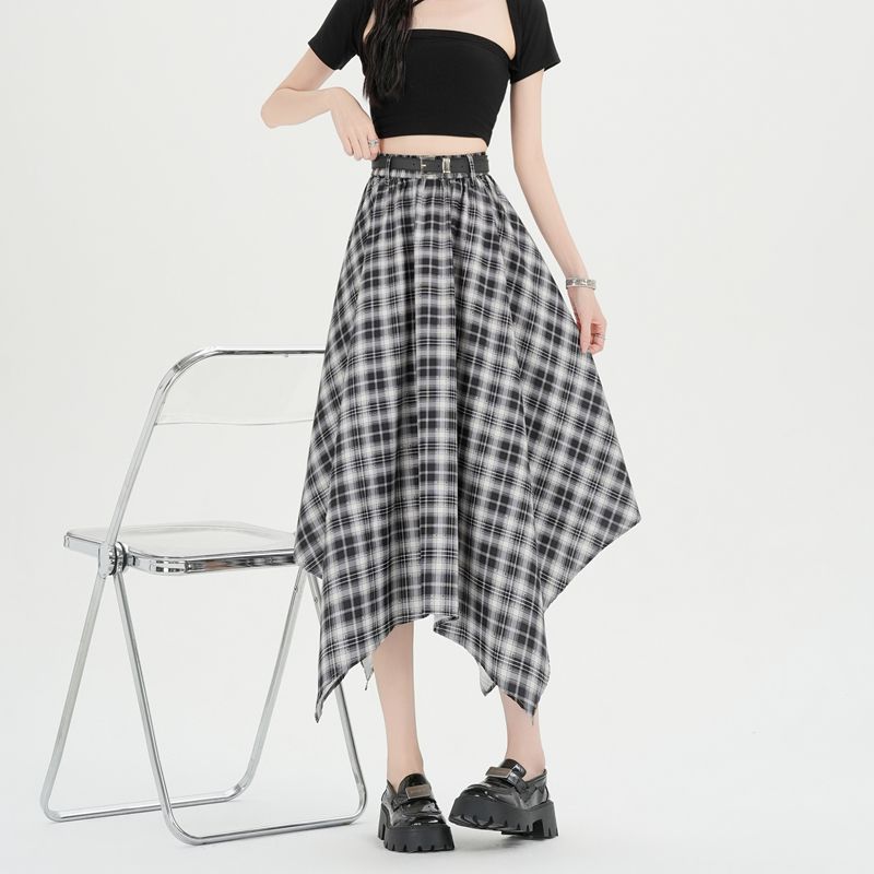 Home > 短裤、半身裙 > 格子裙不规则半身裙夏季复古百搭中长款伞裙高腰A字裙子 服裝批發女裝批發服飾貨源