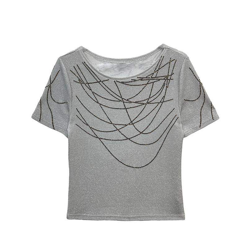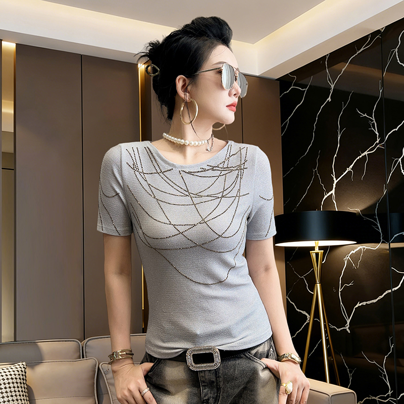 夏新款烫钻网纱圆领短袖工艺t恤女时尚修身打底衫潮 服裝批發女裝批發服飾貨源