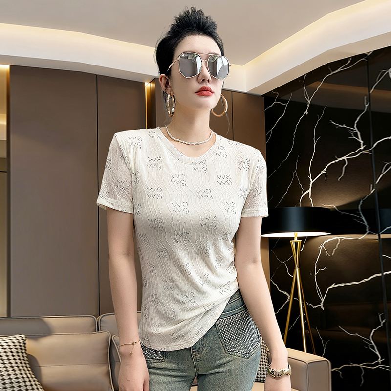 BY17651# 春夏新款圆领短袖镂空烫钻网纱t恤女时尚修身打底衫潮 服裝批發女裝批發服飾貨源