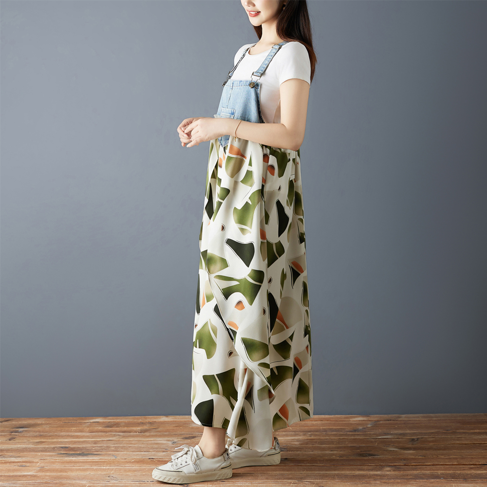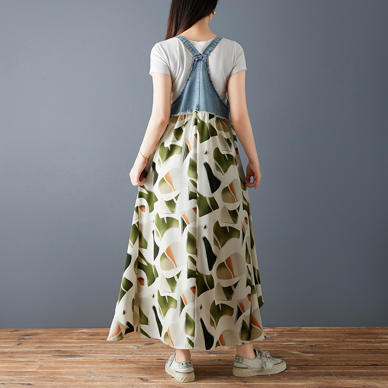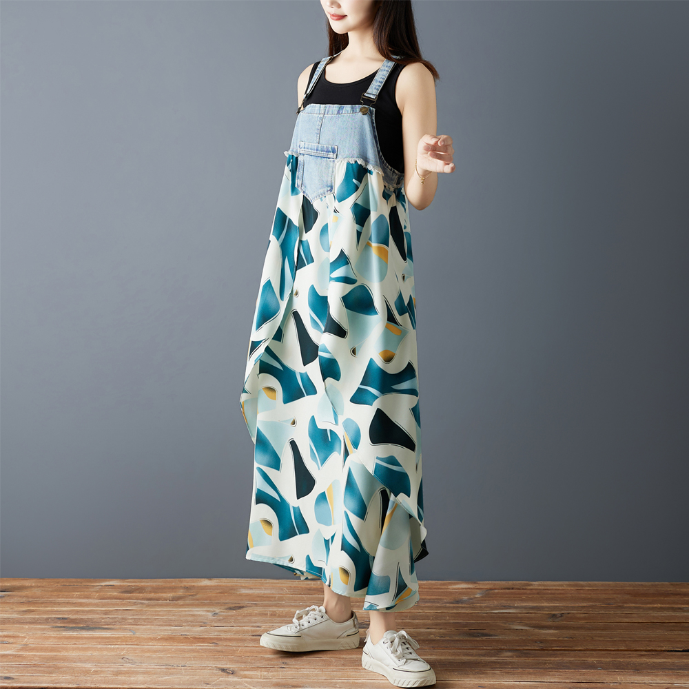 夏季新款荷叶边宽松雪纺印花牛仔设计感背带中长款连衣裙 服裝批發女裝批發服飾貨源