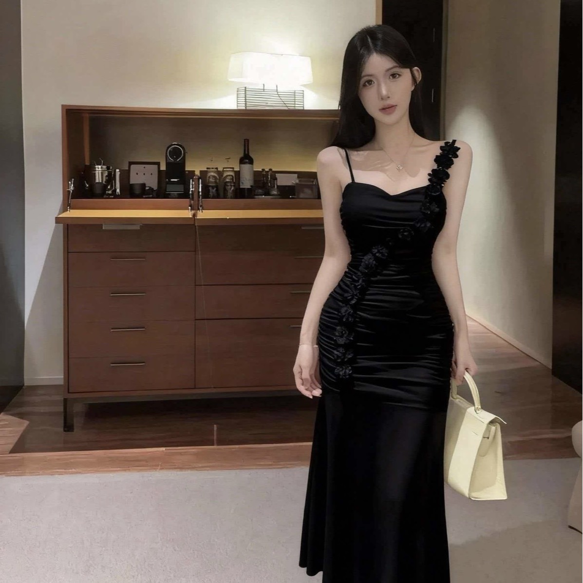 BY17690# 温柔风立体花饰吊带连衣裙收腰显身材褶皱开叉晚宴裙 服裝批發女裝批發服飾貨源