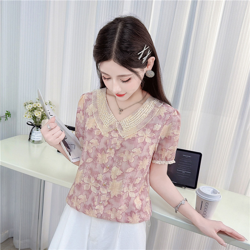 娃娃领雪纺衬衫女装夏季新款钉珠时尚碎花漂亮小衫短袖上衣 服裝批發女裝批發服飾貨源