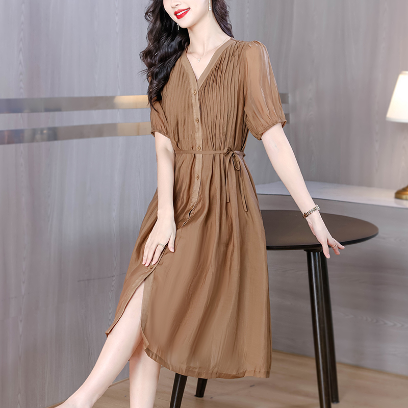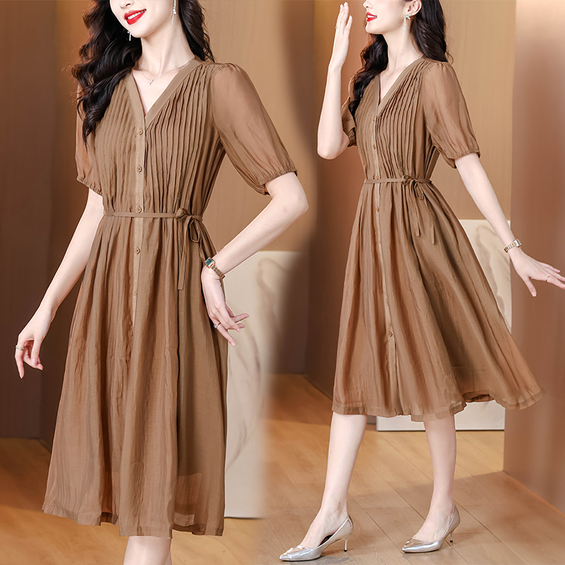BY17927# 时尚褶皱连衣裙女夏季新款V领简约长裙欧货减龄女装 服裝批發女裝批發服飾貨源