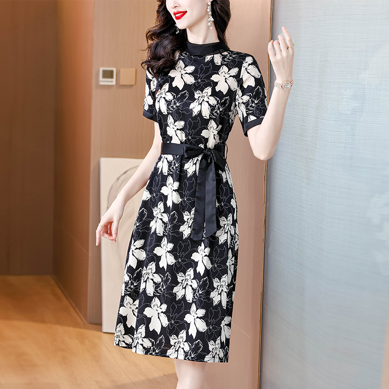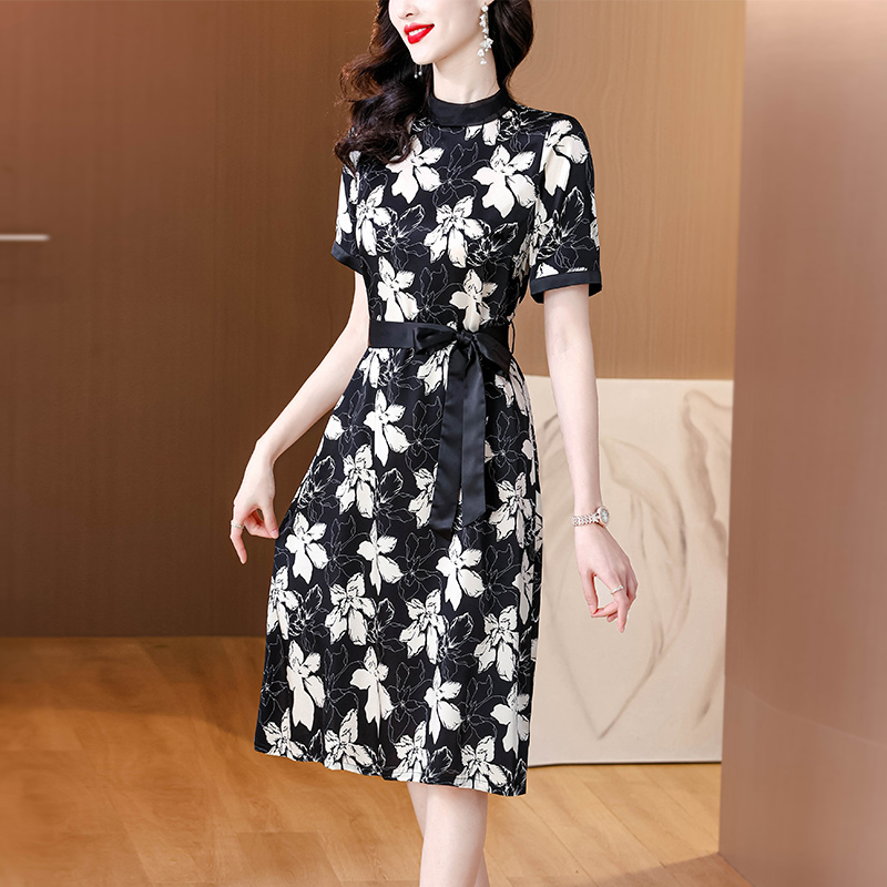 BY17928# 夏季新款名媛气质宽松腰带优雅时尚印花高档桑蚕丝连衣裙 服裝批發女裝批發服飾貨源