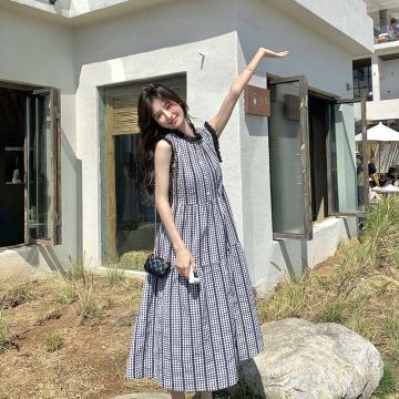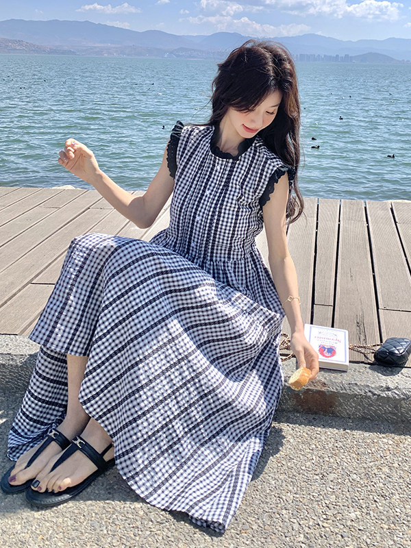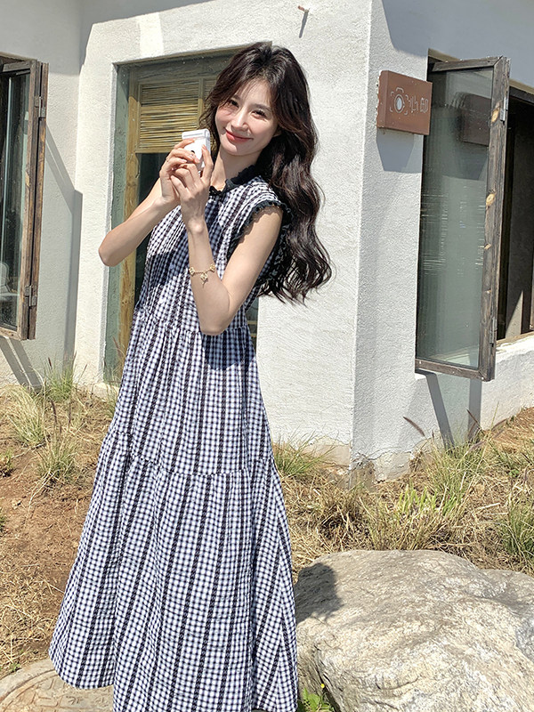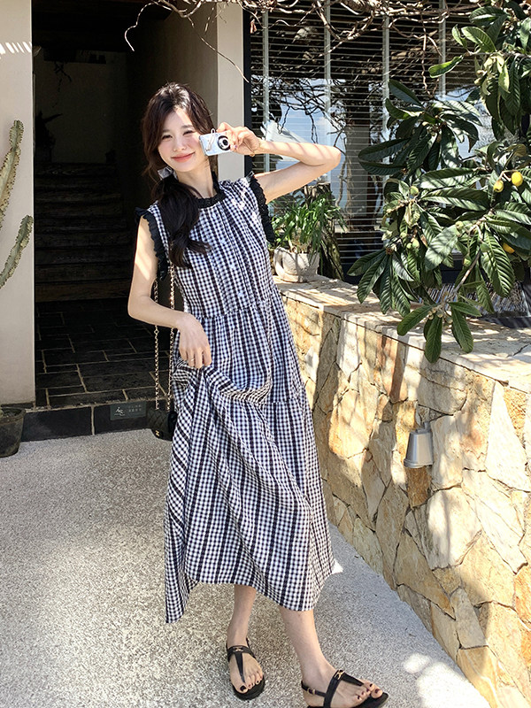 BY17955# 法式复古格子无袖连衣裙女夏新款木耳边A字裙显瘦不撞款长裙 服裝批發女裝批發服飾貨源