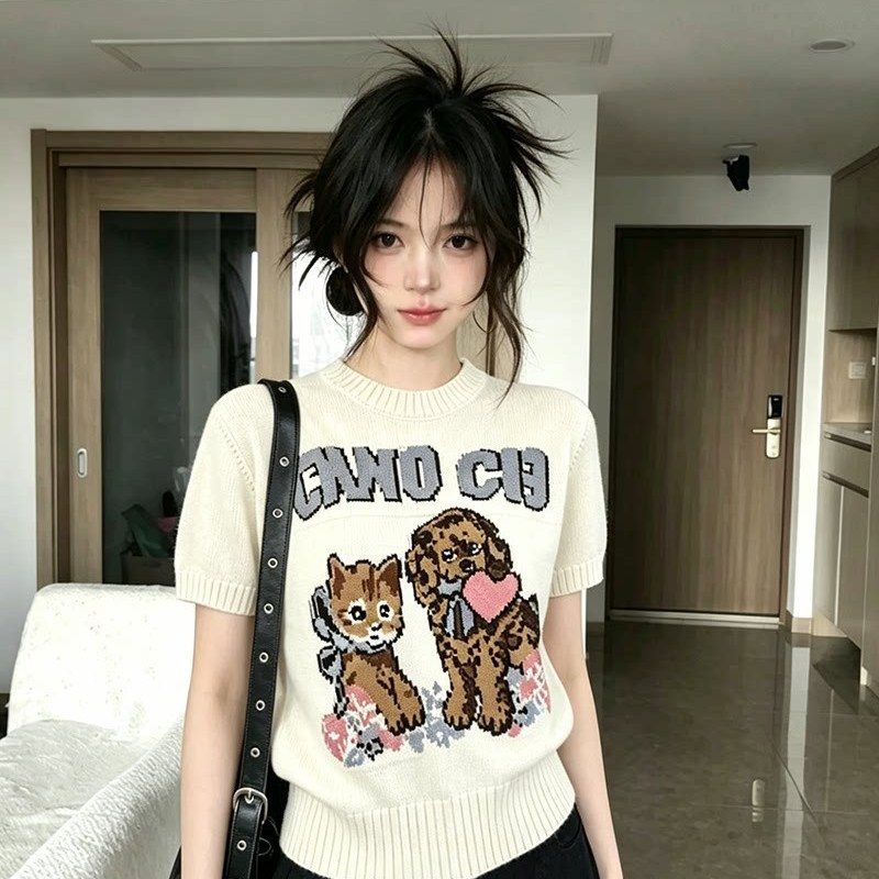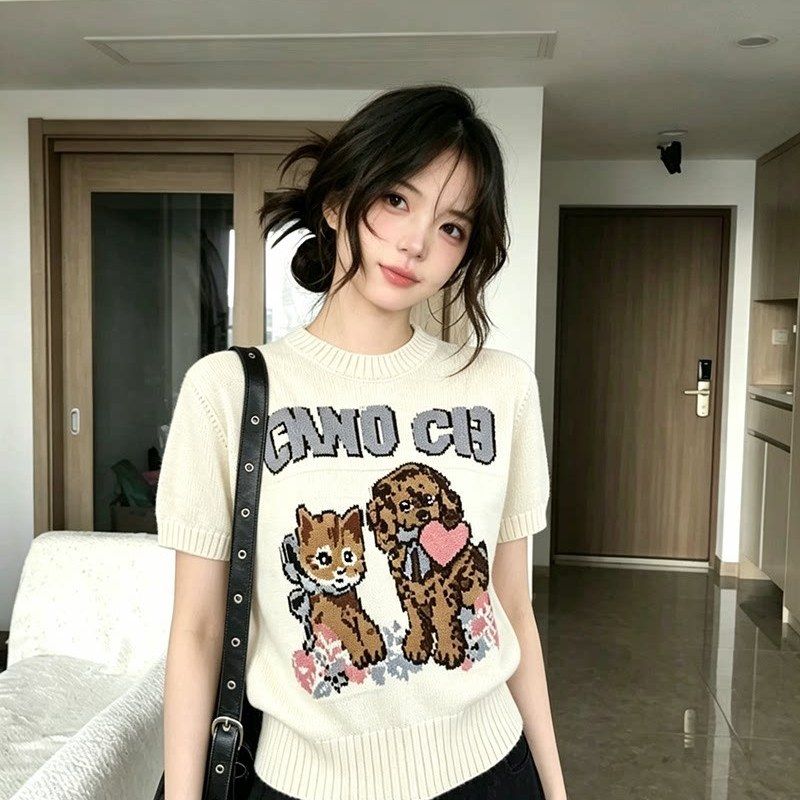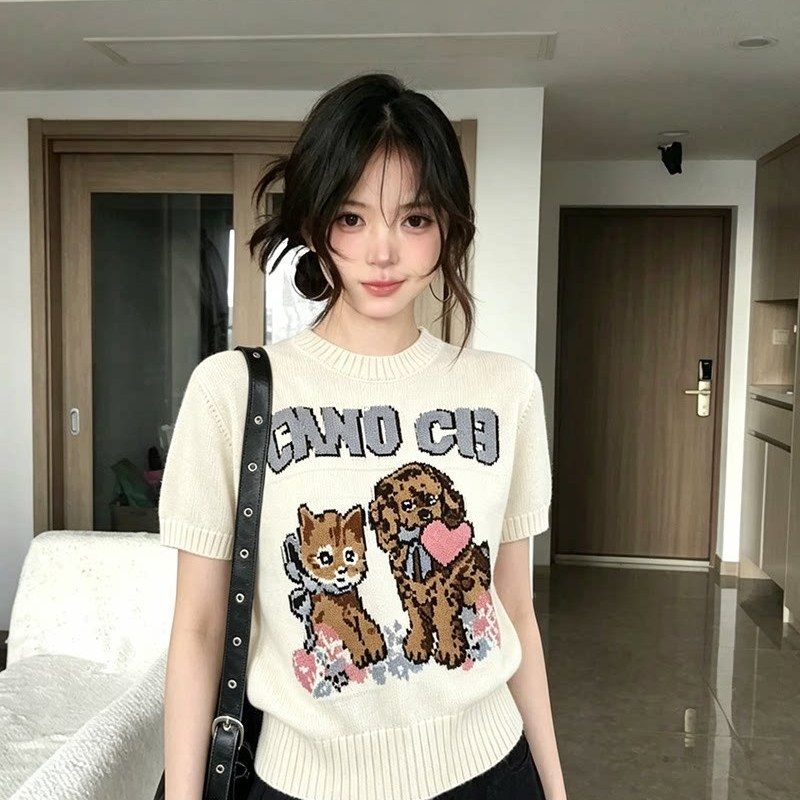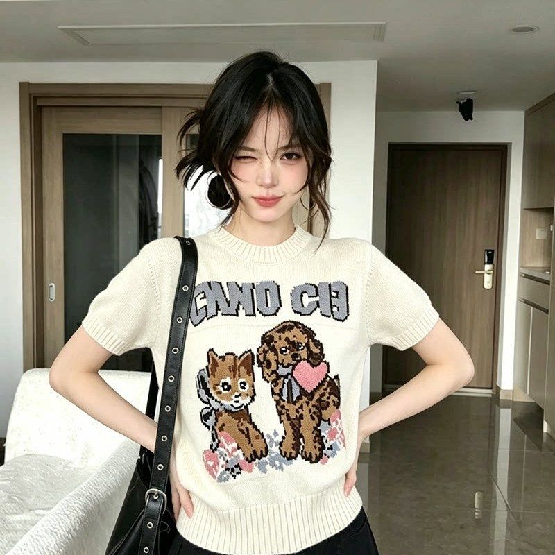 BY18037# 复古风童趣复古针织衫萌宠短袖夏季卡通新款提花圆领上衣针织 服裝批發女裝批發服飾貨源