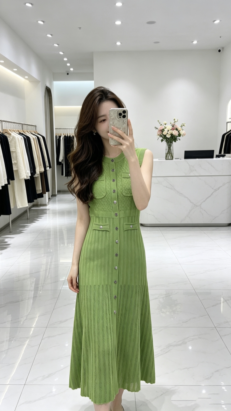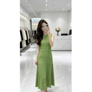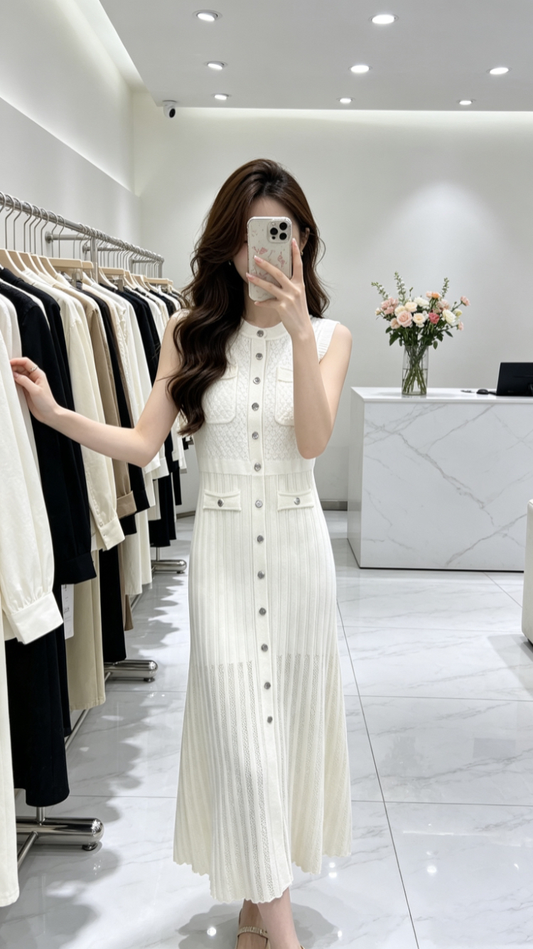 BY18049# 法式气质名媛温柔无袖针织长裙子女夏季新款单排扣黑色镂空连衣裙 服裝批發女裝批發服飾貨源