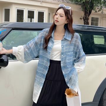 BY18081# 韩版春季亮片提花横条衬衫设计感上衣镂空宽松防晒衣女衬衣外套潮 服裝批發女裝批發服飾貨源