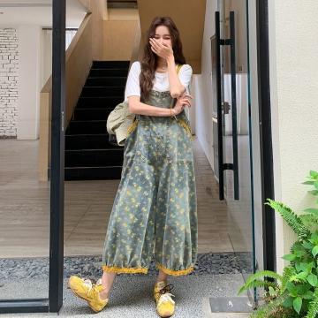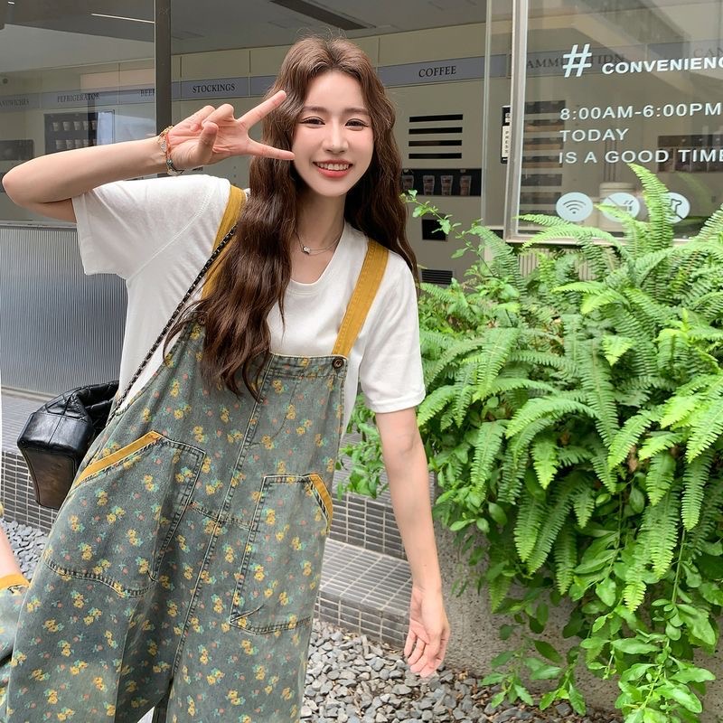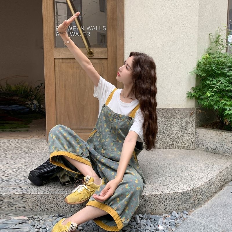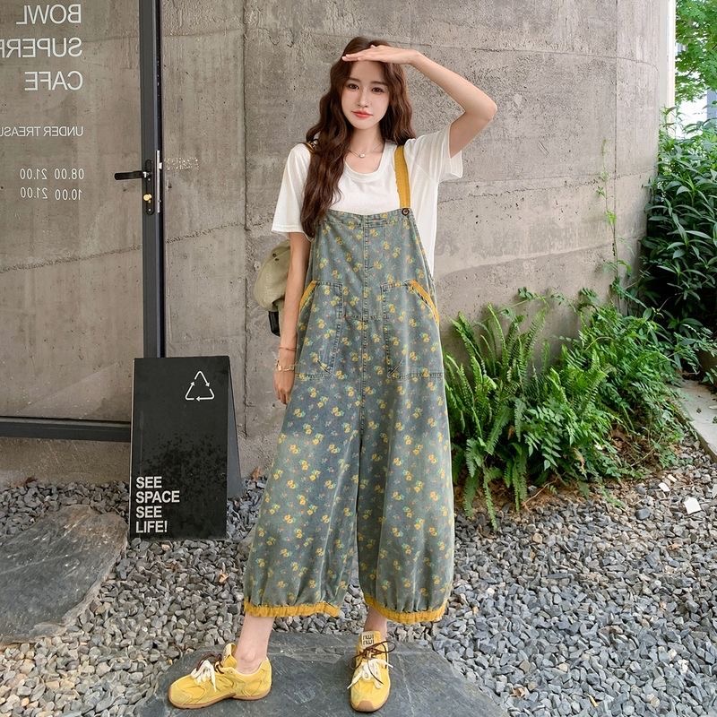 BY18117# 黄色巨好看碎花牛仔背带裤新款女夏超火减龄阔腿裤子 服裝批發女裝批發服飾貨源