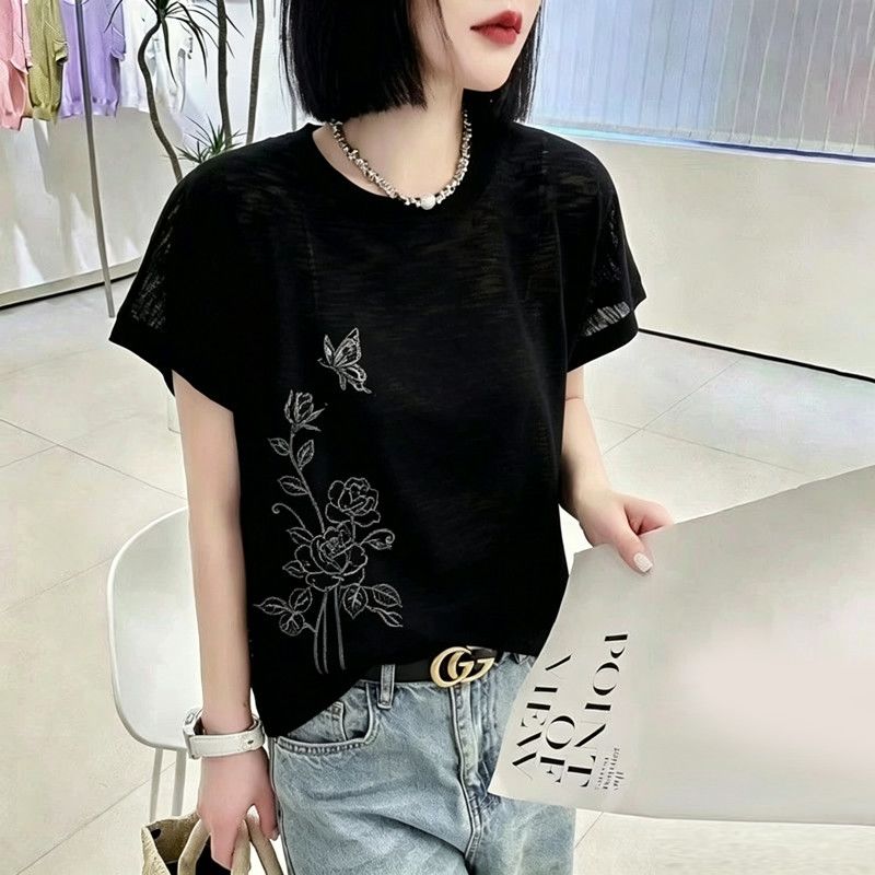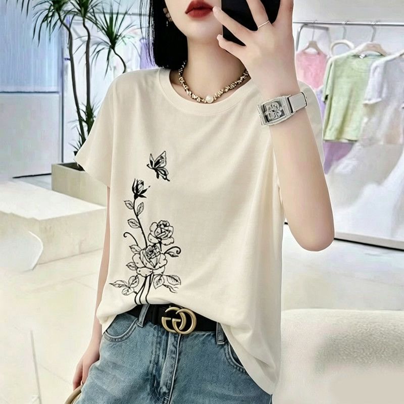BY18122# 竹节棉夏季新款短袖印花大码宽松百搭休闲圆领上衣T恤 服裝批發女裝批發服飾貨源