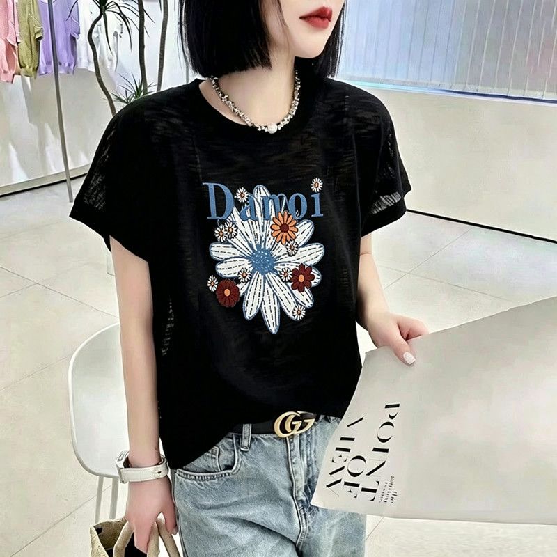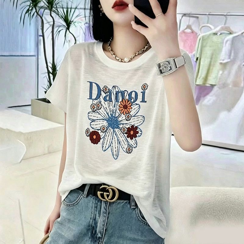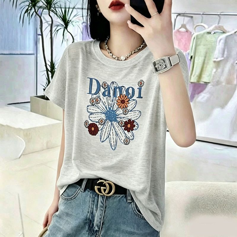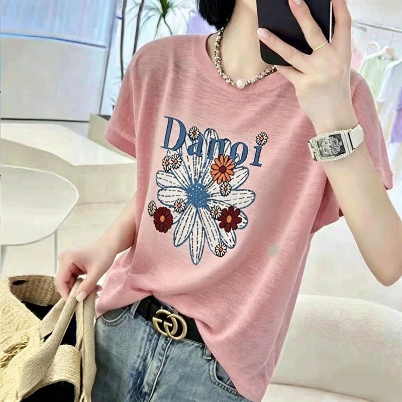 BY18126# 竹节棉夏季新款短袖印花大码宽松百搭休闲圆领上衣T恤 服裝批發女裝批發服飾貨源