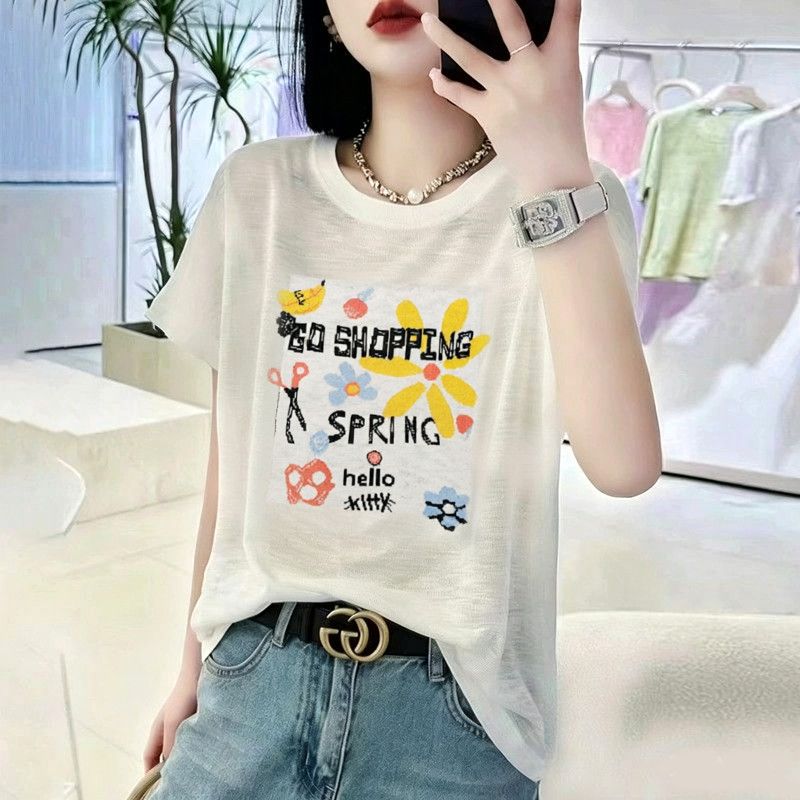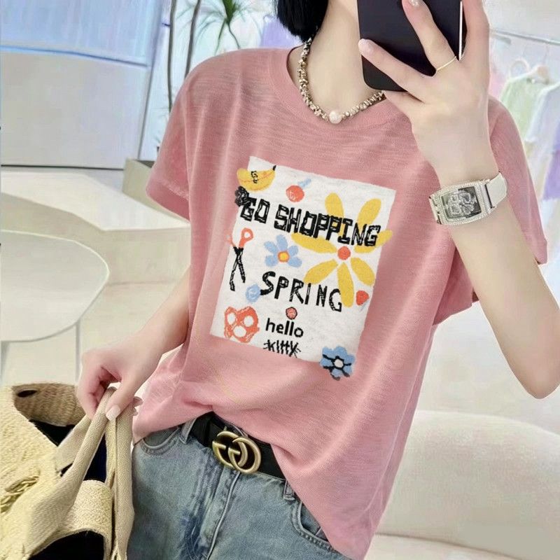 BY18127# 竹节棉夏季新款短袖印花大码宽松百搭休闲圆领上衣T恤 服裝批發女裝批發服飾貨源