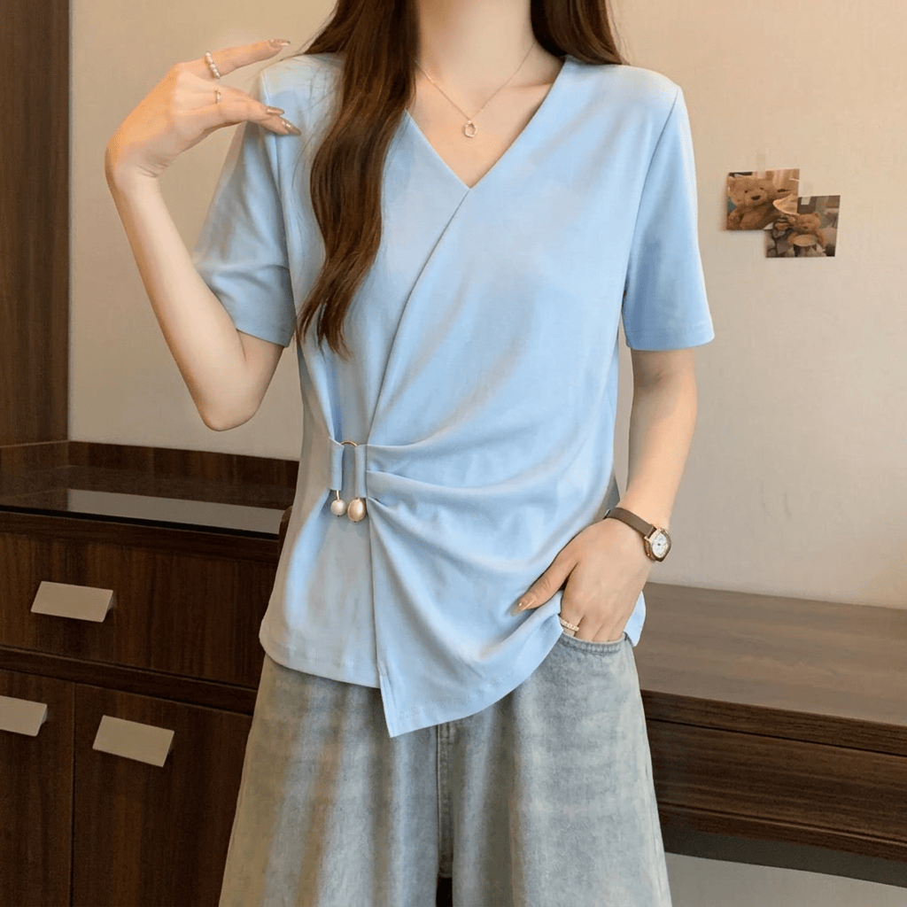 BY18134# 大码女装纯棉设计感交叉V领短袖T恤夏季胖mm显瘦独特别致掐腰小衫 服裝批發女裝批發服飾貨源