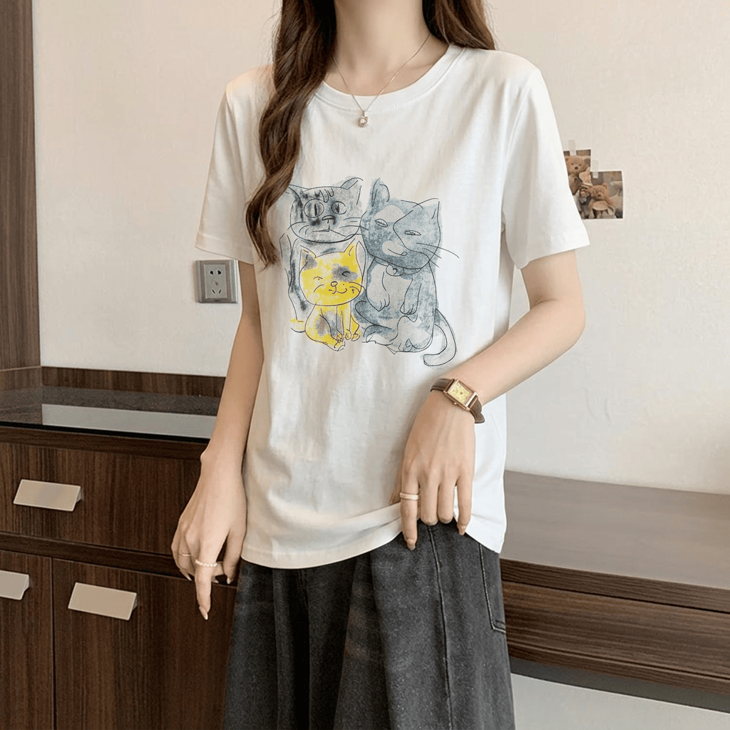 BY18137# 纯棉韩版卡通猫咪短袖t恤女夏季大码胖MM洋气减龄宽松上衣 服裝批發女裝批發服飾貨源